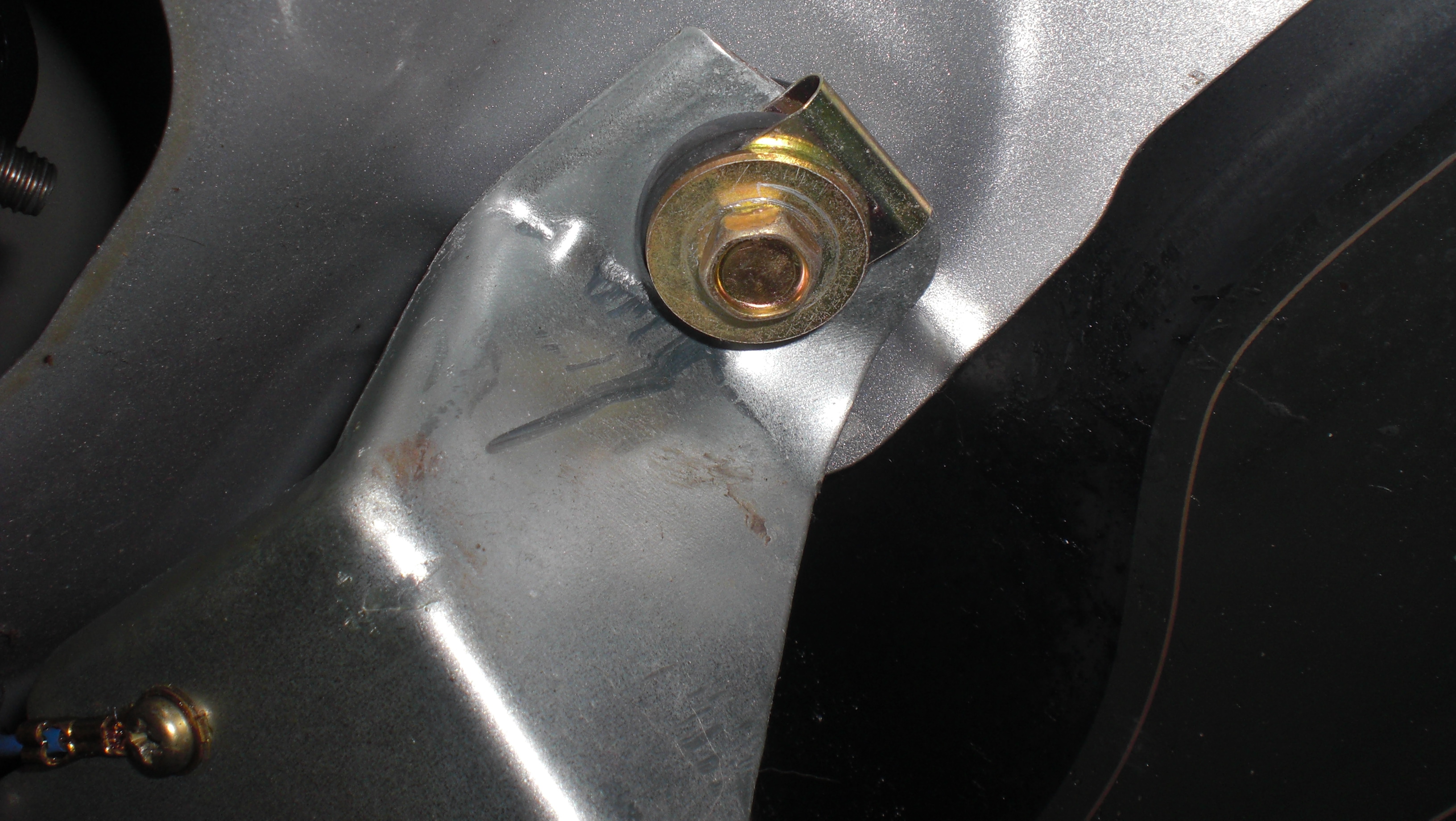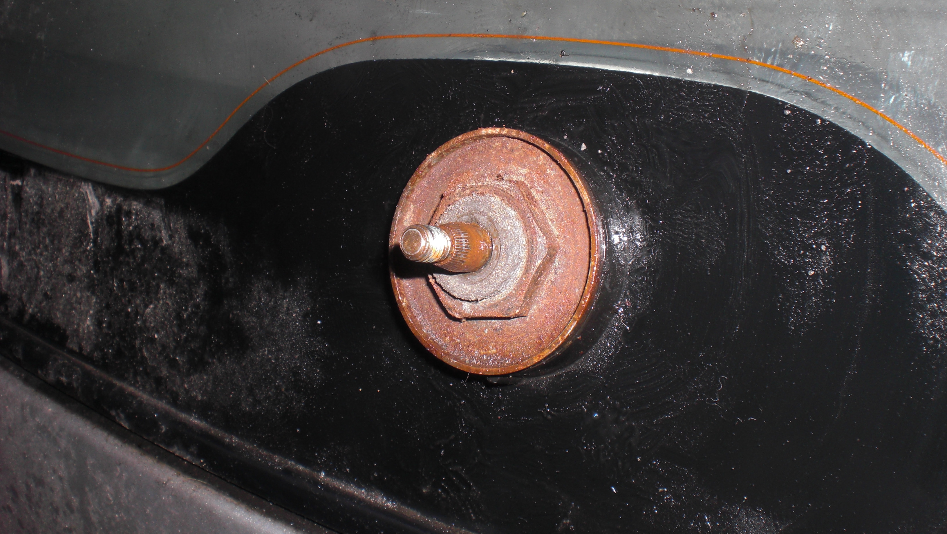 - tak to wyglada bez osłonki. To słynna śruba w rozmiarze 23 – moj sposób odkręcenia to klucz + podbijak i zdecydowane opukanie, penetrator molibdenowy (rust remover czyli taki z odrdzewianiem) (szpraj), znowu popukać, dobrze wyczyścić małą szczotką drucianą, i tak w kółko, aż pójdzie. Nie użyłem jakiejś mega siły. Ostateczni poszlo u mnie z momentem mysle ze w okolicach 80- 90 Nm (koła dokreca sie w przedziale 100 -120 bodajże). Sam proces odkrecania trwał ze 3,4 godziny – przetrzyj, puknij, pskinij, idź robić coś innego itd. Az puściło. Pomogło mi również przykładanie pręta miedzianego do kazdego z boków nakretki i pukniecie stanowcze podbijakiem.