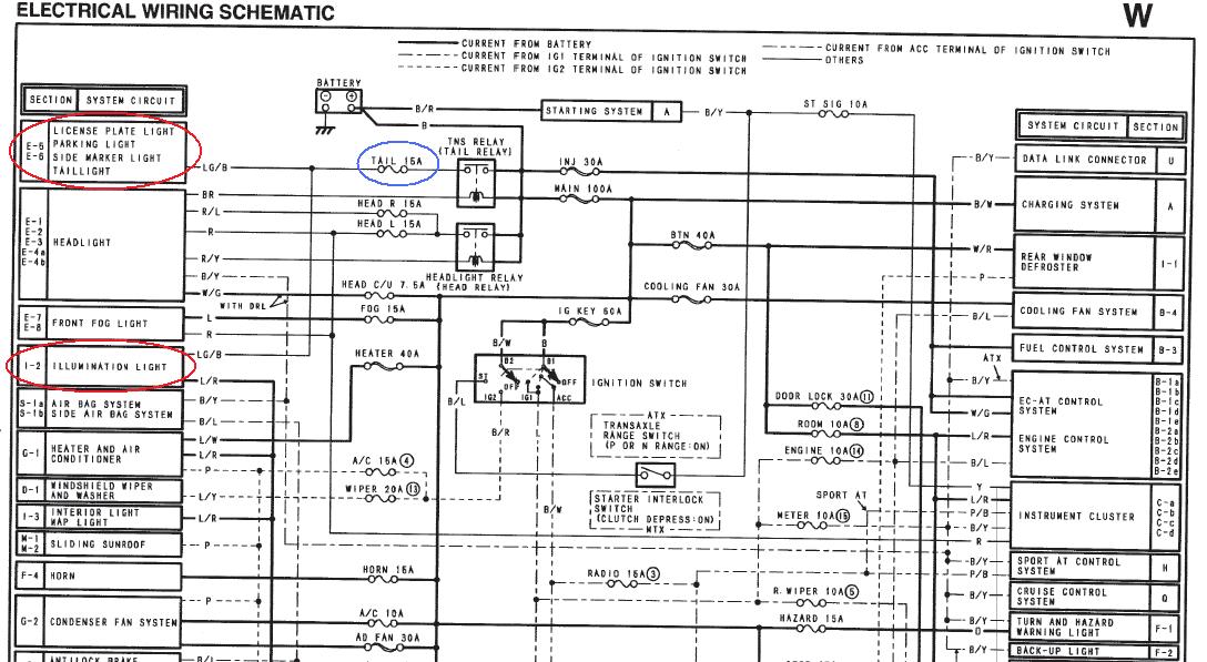 Mam ostatnio problem z tylnymi światłami tzn. nie świecą. Dodatkowo nie świeci podświetlenie zegarów i wszelkich przełaczników na desce rozdzielczej. Znalazłem schemat blokowy instalacji elektrycznej z której wynika który bezpiezcznik jest za to odpowiedzialny.
