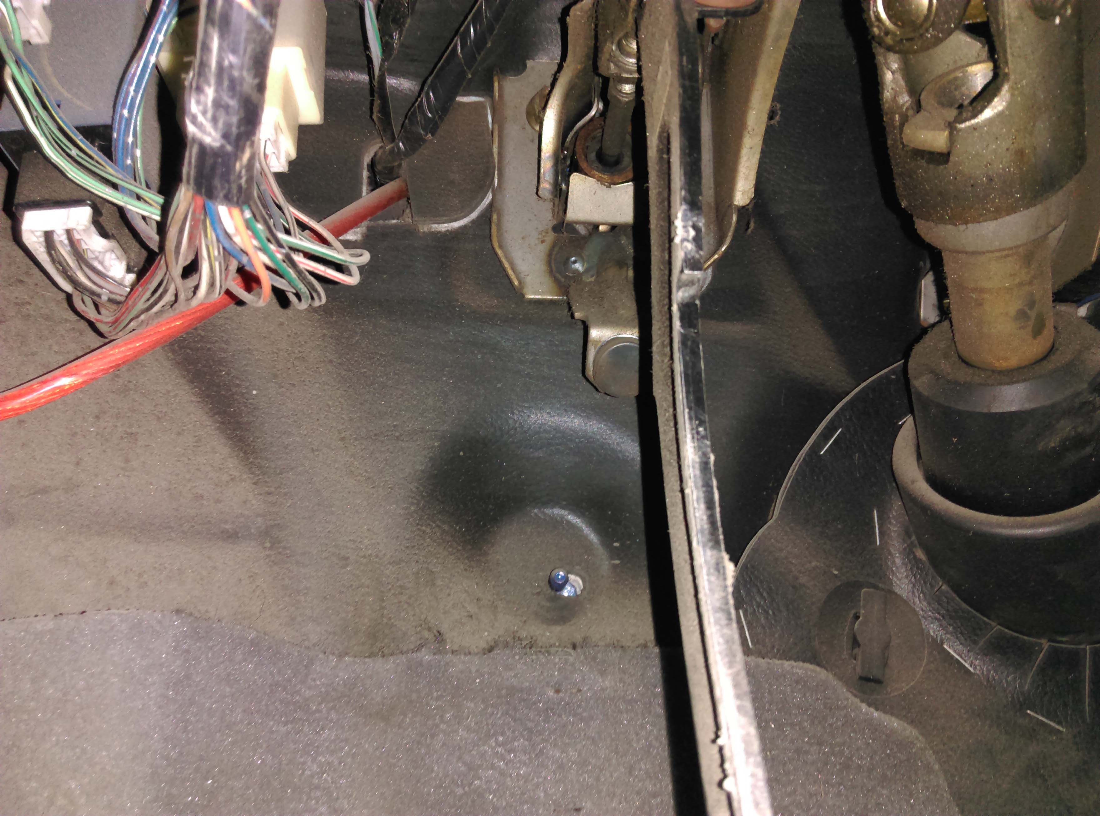 Przewody przepuszczone przez zaślepkę znajdującą się zaraz za pedałami, na wysokości ich mocowań. Zdjęcia niestety nie mam żadnego.