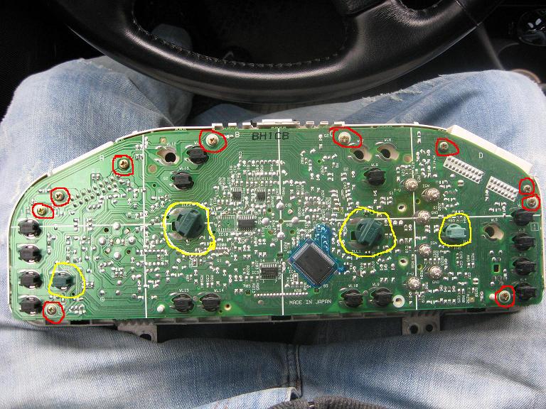 Odkręcamy wszystkie śrubki zaznaczone na czerwono, na żółto zaznaczyłem żarówki, które podświetlają tarcze zegarów – jakby ktoś chciał sobie zmienić podświetlenie na inny kolor.