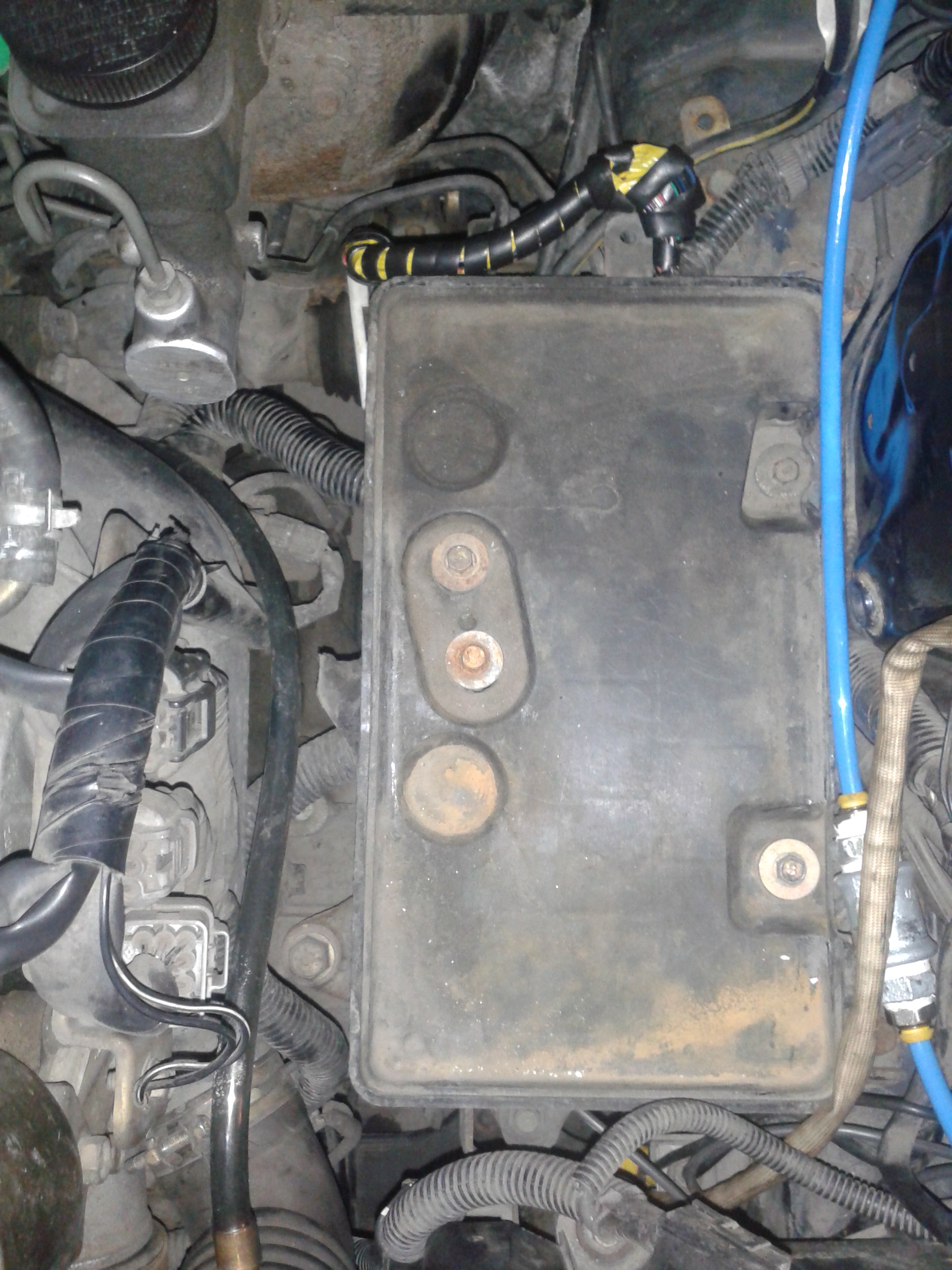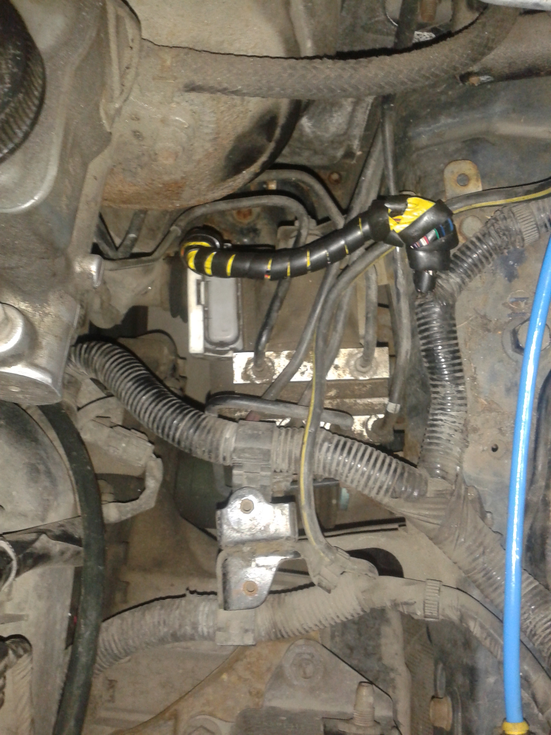Pompa znajduję się pod podstawą akumulatora. Widać na pierwszym zdjęciu także kawałem wiązki zabezpieczonej owijką i żółtą taśma izolacyjną. Tu ktoś wymieniał wcześniej wtyk ABS'u, na szczęście zostało to fachowo polutowane. Przykręcone jest to czterema śrubami na klucz 10. Mogą ciężko iść.
