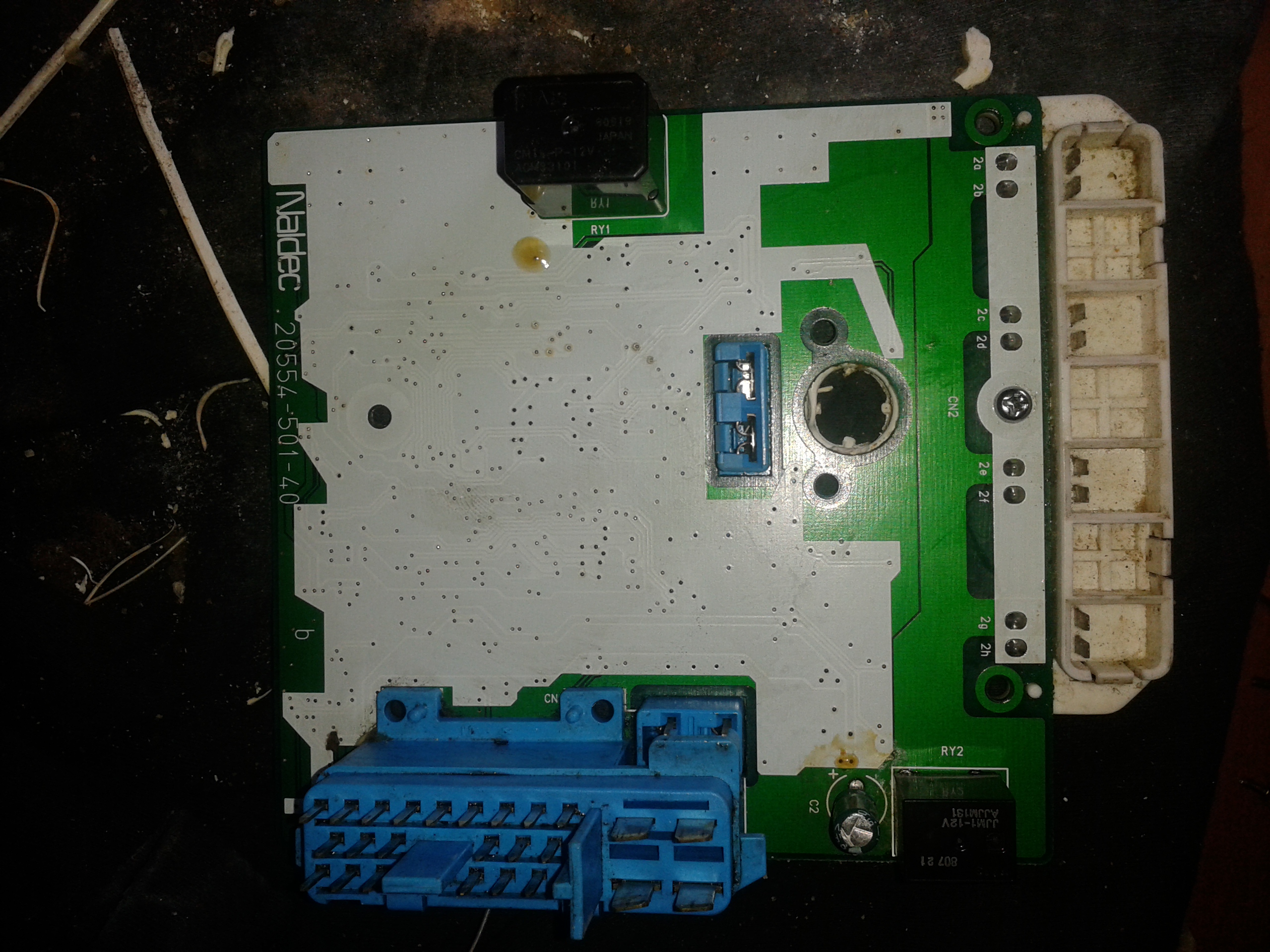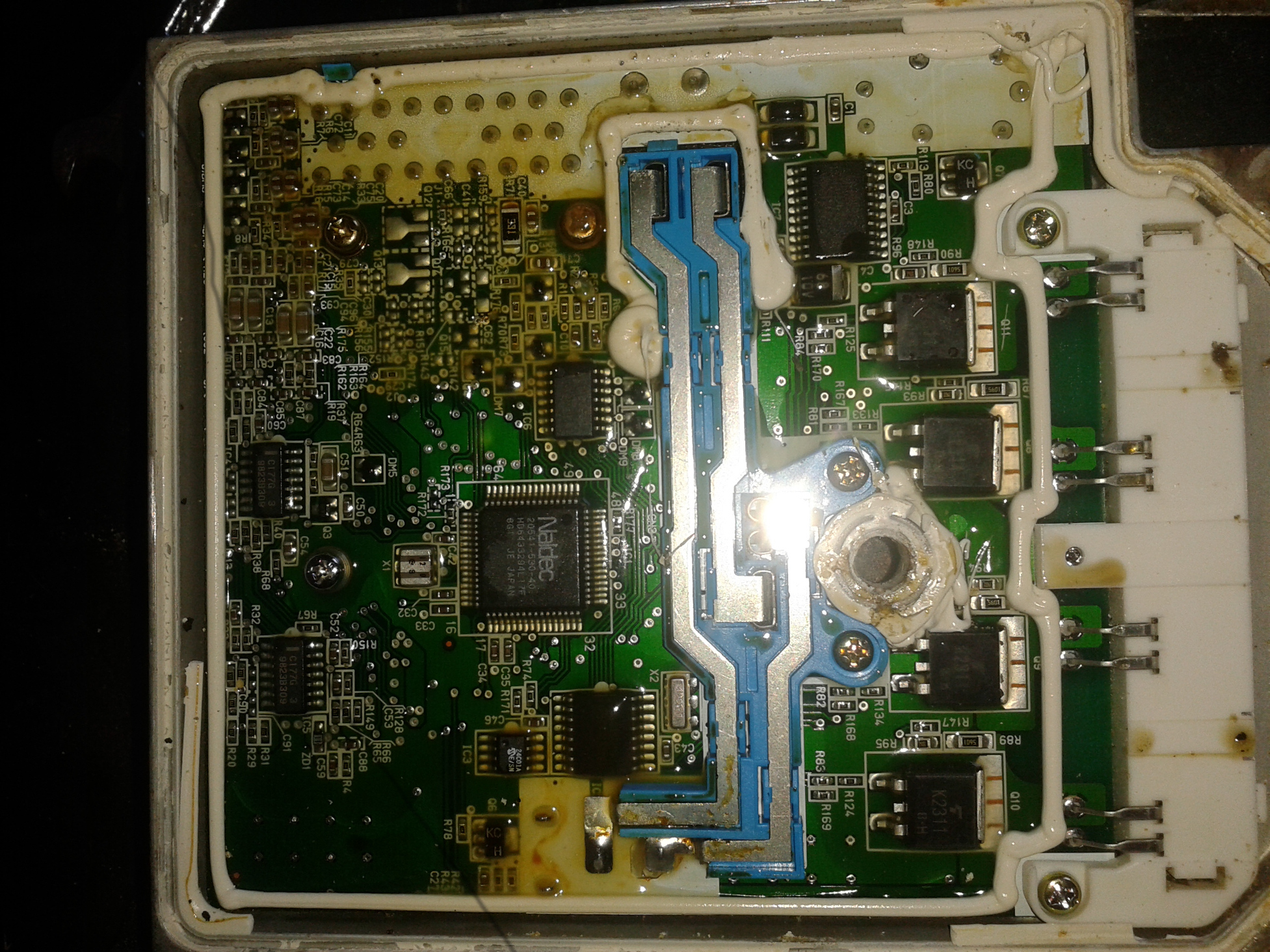 Teraz odkręcamy elektronikę z obudowy. Jest tam 7 śrubek, 3 pod silikonem i 4 koło gniazd. Cieżko je pominąć. Teraz najtrudniejsze. Aby wyjąć elektronikę trzeba podważyć w zasadzie po kolei zatrzaski na plastikach. Zatrzaski znajdziemy przy długim szarym przyłączu, niebieskim podwójnym na środku płytki oraz dwa po zewnętrznej stronie głównego przyłącza. Jak to zrobimy zobaczymy takie coś. Trzeba to tez wszystko ładnie wyczyścić j/w pędzelek w rękę i do czysta.