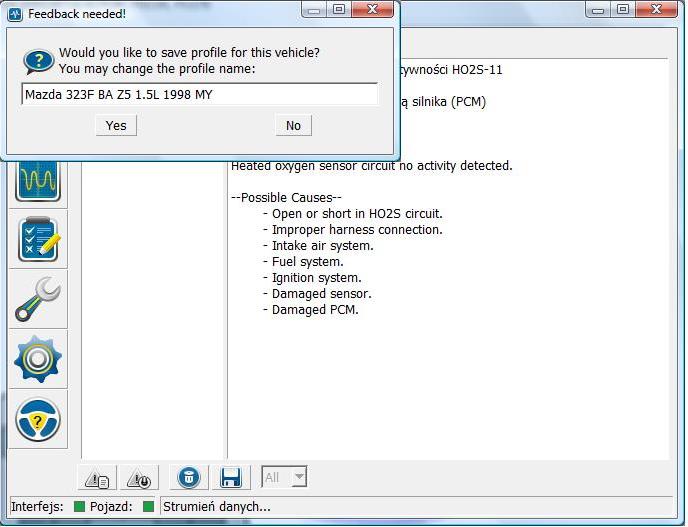 Mazda 323f 96r przed liftem, silnik z5 kody dwucyfrowe, program działa dobrze w przypadku odczytu kodów błędów, odczytu parametrów w czasie rzeczywistym nie dokonałem bo po odpaleniu silnika zawiesza mi się program, bez odpalania podgląd jest. Będę próbował z innym kablem jeszcze. Wreszcie jest program do diagnostyki mazdy