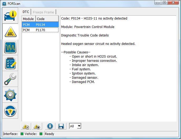 Jak widać w module sterowania silnika PCM zostały zarejestrowane dwa błędy sugerujące uszkodzenie sondy lambda, a dokładnie uszkodzenie w obwodzie zasilania podgrzewacza sondy. W dolnej cześć okna umieszczone zostały dwie ikony oznaczone wykrzyknikiem. Pierwsza umożliwia nam ponowny odczyt zarejestrowanych błędów, druga natomiast umożliwia nam ich wykasowanie po wykonanej naprawie.