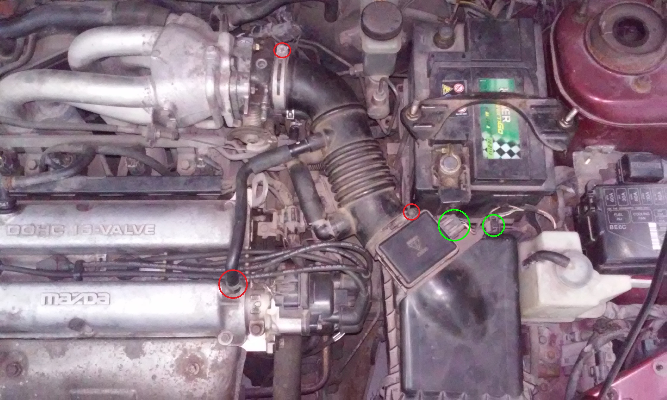 Punkt 2 – odkręcamy śruby dolotu (czerwone pętle) klucz 10. Odłączamy wtyczki przepływomierza i czujnika temperatury powietrza (zielone pętle). Zdejmujemy również wężyk (czerwona pętla).