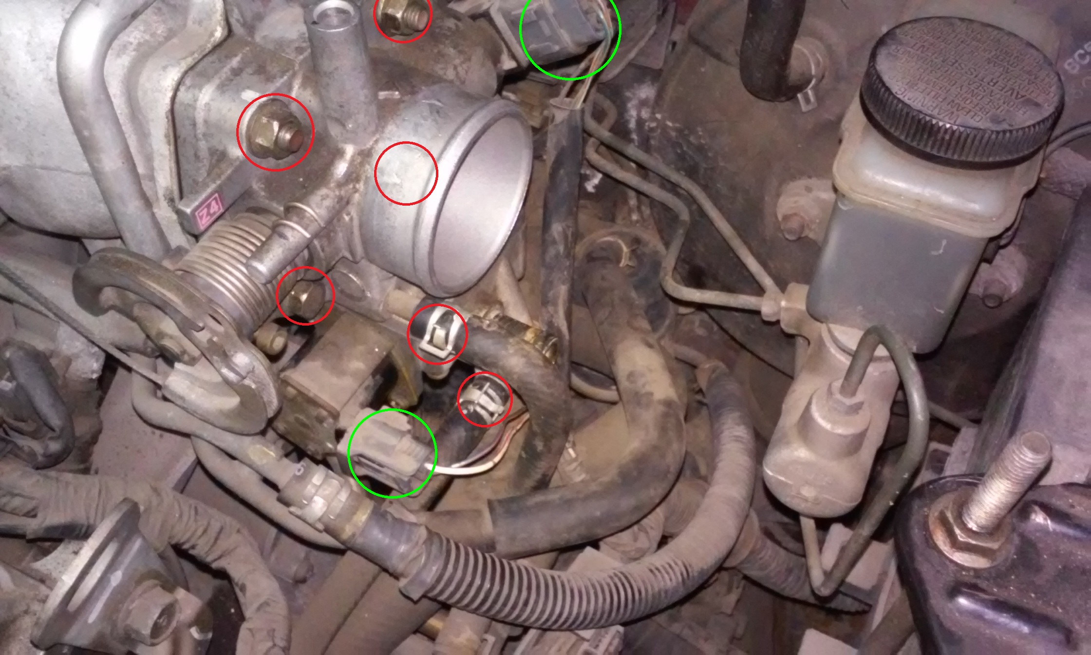 Punkt 3 – odpinamy wtyczkę elektrozaworu oraz czujnika TPS (zielone pętle). Kombinerkami ściskamy opaski oraz zsuwamy je z króćców wężyków doprowadzających płyn chłodniczy do przepustnicy (czerwone pętle). Odkręcamy śruby przepustnicy (czerwone pętle – czwarte śruba niewidoczna) klucz 12. Wypinamy jeszcze linkę gazu (zrobić to delikatnie by jej nie pogiąć) i wyjmujemy przepustnicę.