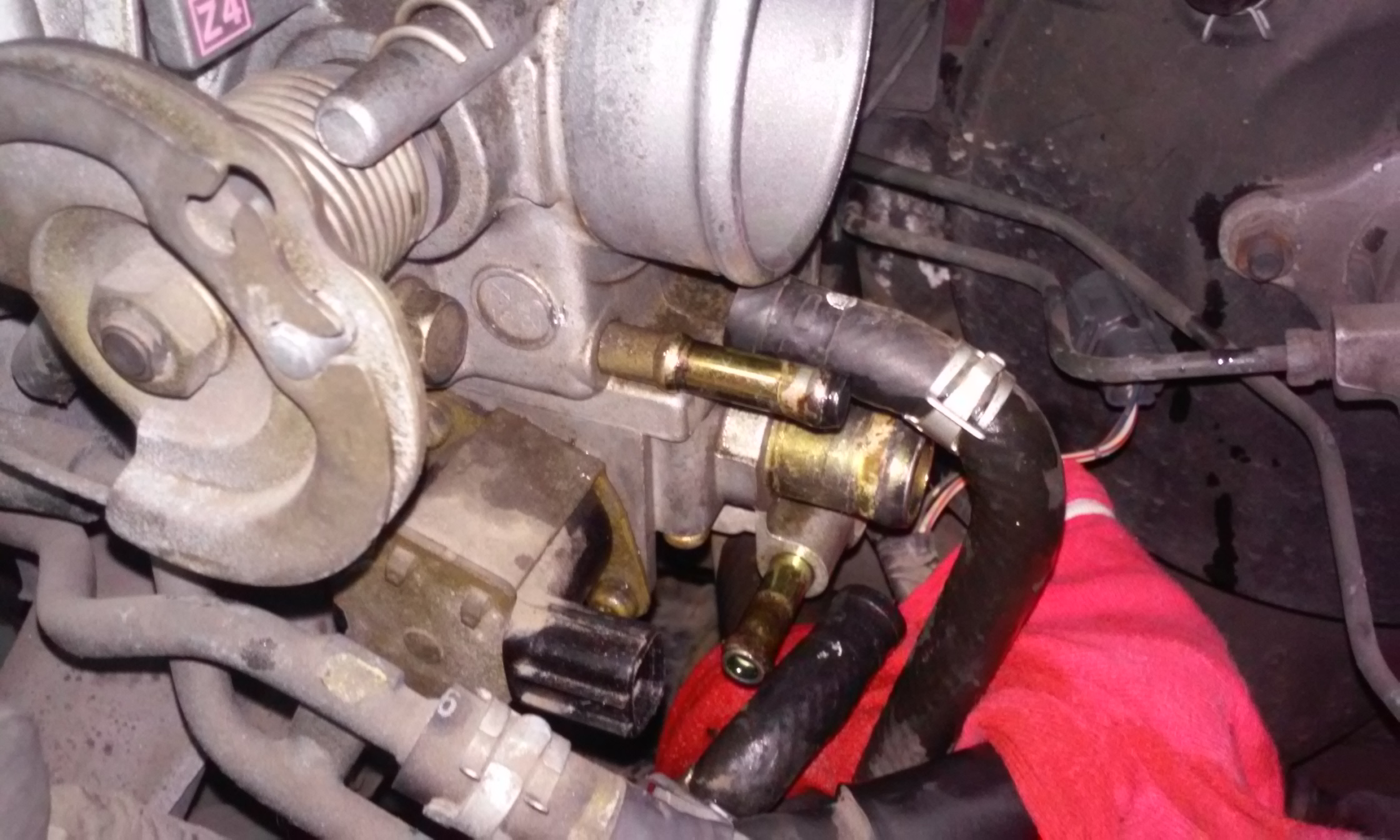 Na poniższym zdjęciu widać ściągnięte wężyki. Nie trzeba ich zatykać. Należy podłożyć ścierkę by płyn znajdujący się w przepustnicy spłynął i nie zmoczył pozostałych elementów silnika.