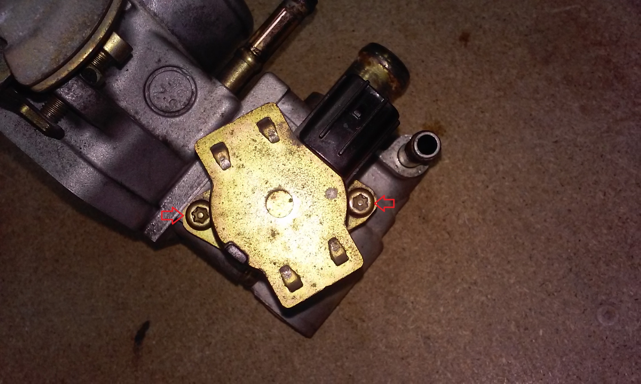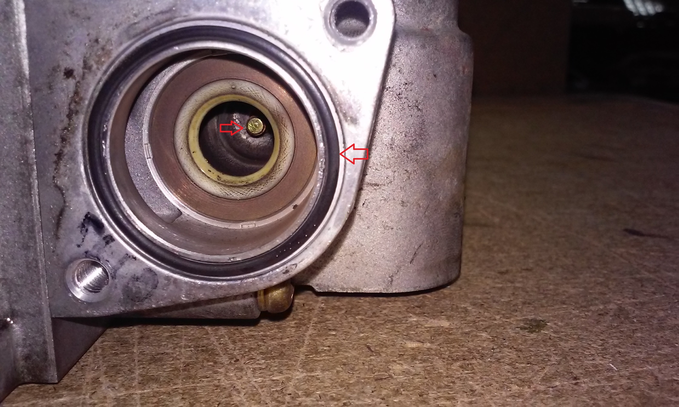 Następnie należy złożyć do to stanu pierwotnego i sprawdzić czy trzon zaworu porusza bez żadnych oporów. Następnie czyścimy gniazdo zaworu przedstawione na poniższym zdjęciu. Strzałkami zaznaczyłem śrubę regulacyjną domykania zaworu i jeśli są co do tego wątpliwości to należy przystąpić do jej regulacji tak aby zawór szczelnie się zamykał. Zaznaczona jest również uszczelka elektrozaworu. Jeżeli jest popękana należy ją wymienić.