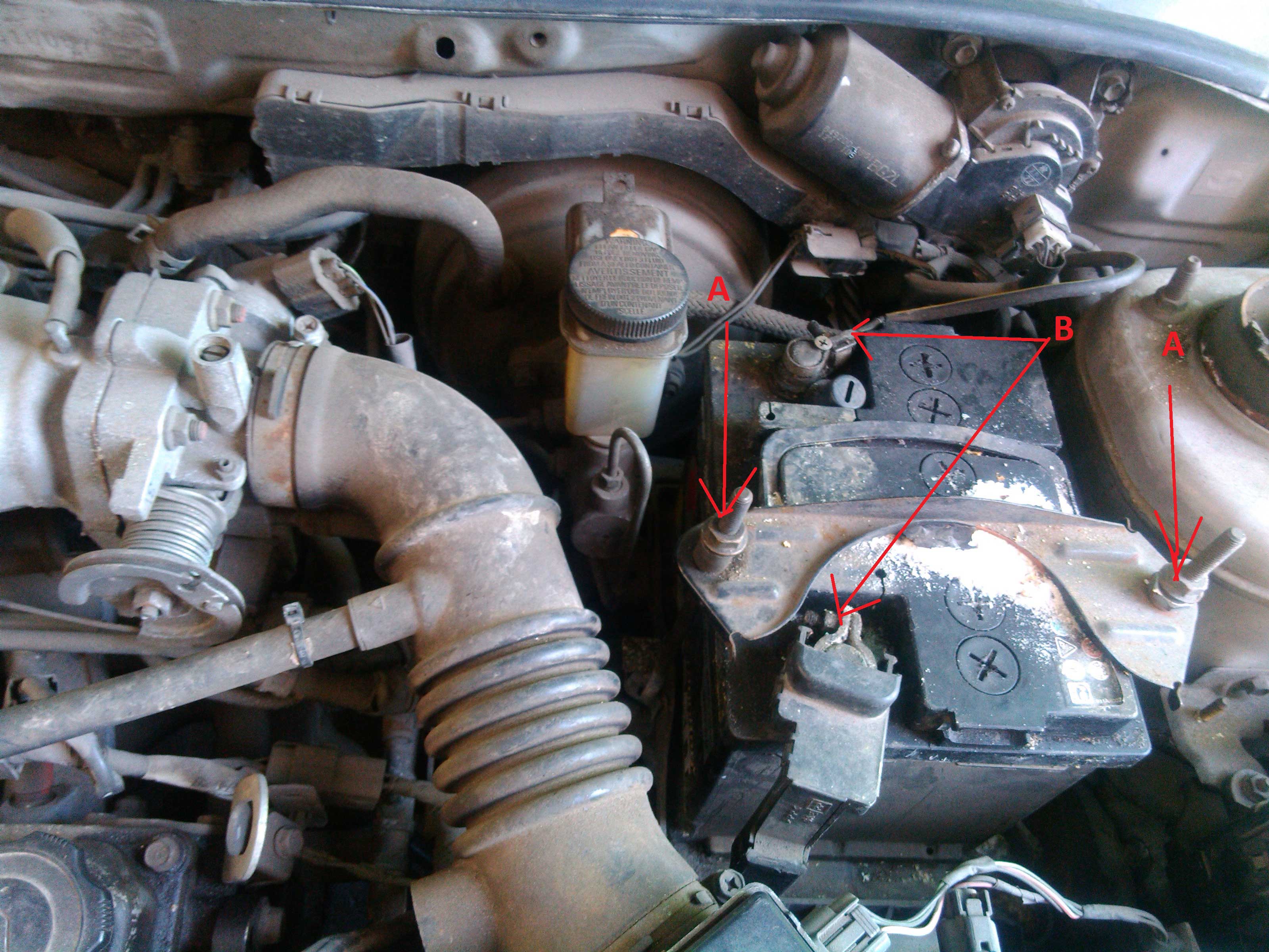 Upewniamy się, że nie ma kluczyka w stacyjce i bierzemy się za akumulator. Odkręcamy mocowanie akumulatora – śruby A (klucz 14) i ściągamy mocowanie. Następnie luzujemy śruby przy klemach akumulatora (śruby B) i zdejmujemy klemy. Akumulator jest wolny więc wyciągamy go i odkładamy na bok.