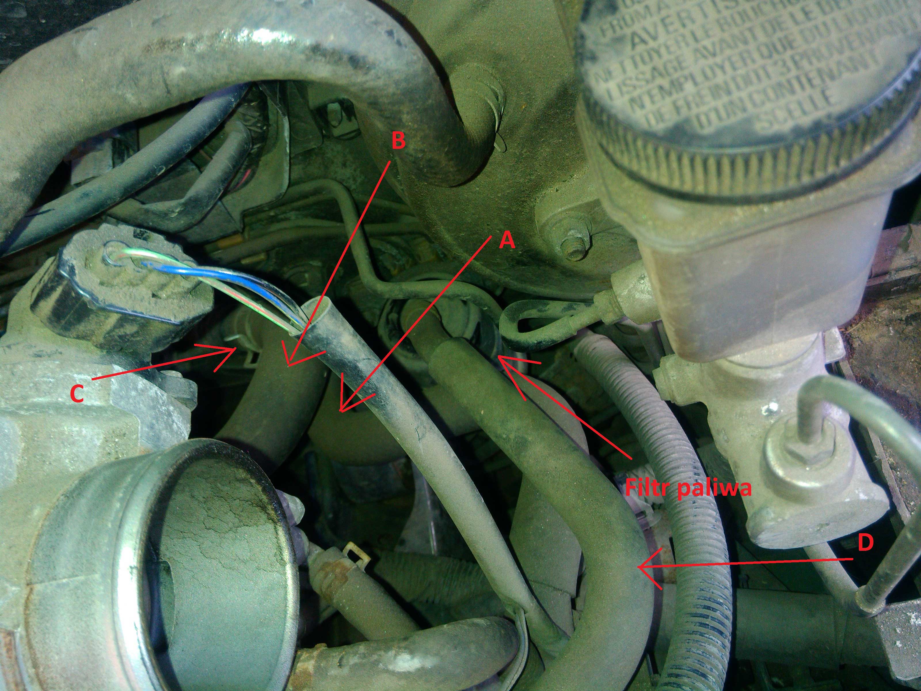 Żeby uzyskać lepsze dojście do filtra paliwa najlepiej wypiąć przewody od spryskiwacza – oznaczone A i B. Ja zacząłem tylko od przewodu B, ale w końcu odpiąłem też przewód A, bo jest tam naprawdę ciasno przy tym filtrze. Żeby wypiąć taki przewód łapiemy zacisk C kombinerkami i zsuwamy go jak najgłębiej na przewód, następie ciągniemy lekko za przewód, kręcąc w obie strony tak, że powinien bez problemu zejść. Kto tego nie robił to warto potrenować bo zaraz będzie to trzeba zrobić z przewodem paliwa :) . Po wypięciu rurki B (od niej zaczynamy) wycieknie trochę płynu ze spryskiwacza. Jak już ścieknie to odginamy tą rurkę maksymalnie w lewo tak żeby nam tu nie zawadzała. To samo tyczy się rurki A, też z niej będzie trochę ciec i jak skończy to odginamy ją w kierunku silnika i o coś zahaczamy, żeby się nie plątała. Na koniec tego etapu łapiemy za osłonę przewodu paliwa (oznaczenie D) i odsuwamy ją jak najdalej od filtra, żeby zrobić miejsce na zacisk.