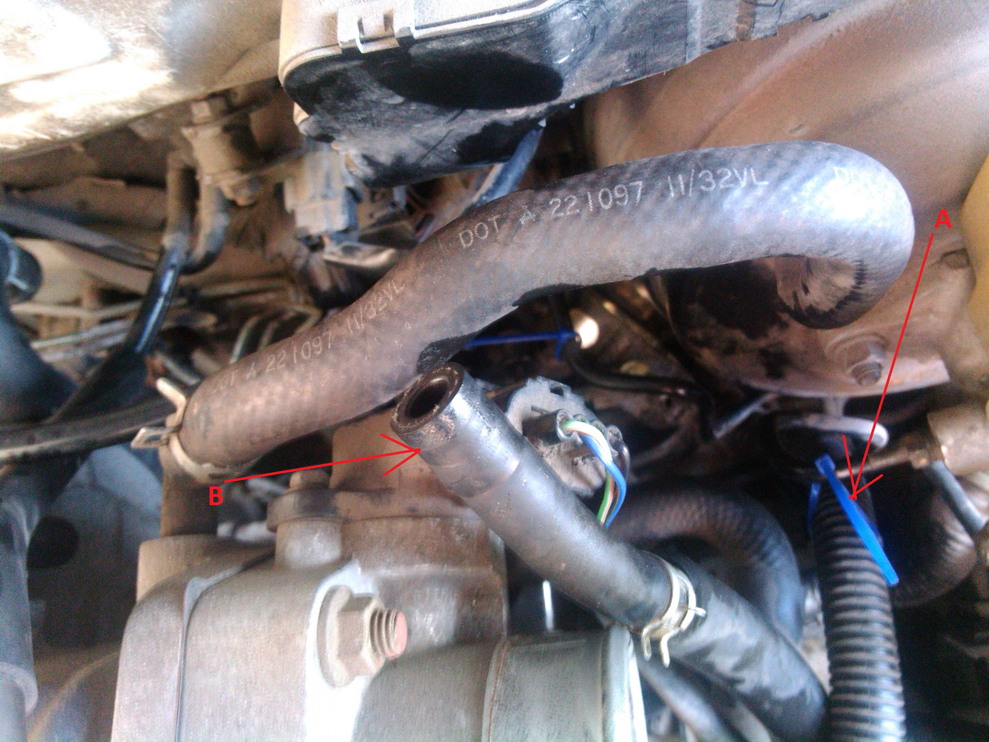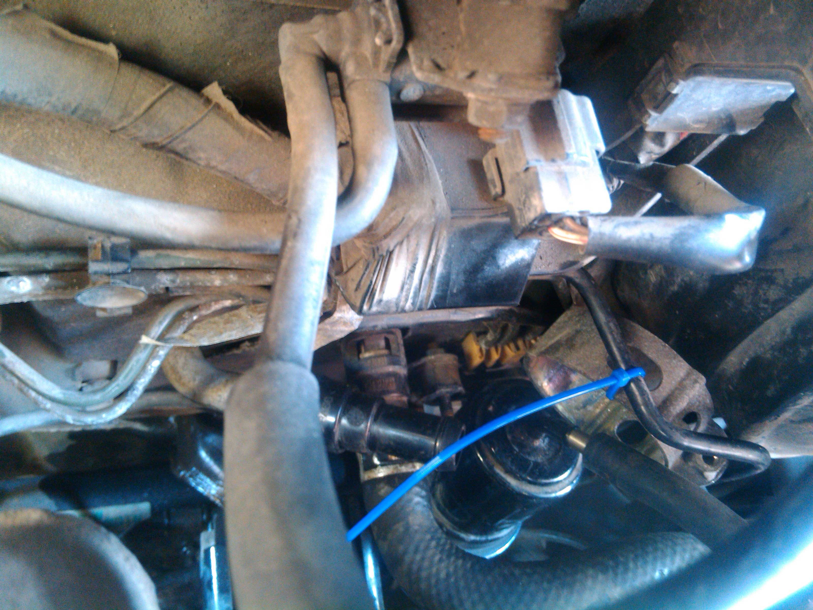 Warto też podwiązać przeszkadzającą rurkę A opaską zaciskową, tak jak na poniższym zdjęciu. Teraz powinno być w miarę luźno przy filtrze, więc go odpinamy. W tym celu najpierw trzeba zsunąć zacisk dolnego (wejściowego) przewodu paliwowego (tego co dochodzi do filtra z dołu :)). Teraz kręcąc filtrem w kółko wykręcamy go z przewodu wejściowego (dolnego). Uwaga: z przewodu zacznie się sączyć paliwo, albo to olewamy (bo ciśnienie powinno być niskie), albo lepiej zatykamy przewód gadżetem którym przygotowaliśmy na początku.