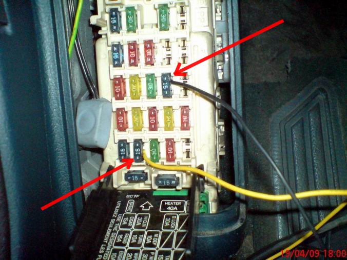 Wyjmujemy bezpieczniki nr 4 i 16 (trochę z oporami mogą wychodzić) i pod zaznaczone na foto pony podkładamy odizolowany kabelek a następnie wkładamy bezpiecznik.