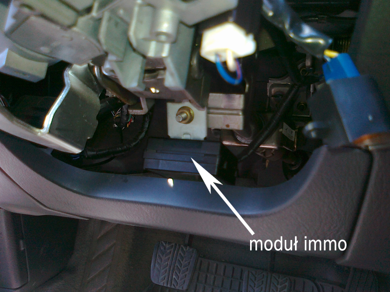 3 dni temu temat immo wrócił jak bumerang w mojej madzi. Zapalam, a ta gaśnie po 3 sek i mruga do mnie kontrolka z kluczykiem. Poprzednim razem problem praktycznie sam się rozwiązał, wymieniłem tylko akumulator i przez pół roku było wszystko dobrze. Tym razem siadłem na forum i faktycznie za dużo się nie dowiedziałem bo nikt nie napisał jak rozwiązał problem, ale troszkę mnie naprowadziliście. Postanowiłem zająć się samymi wtykami na początku. Kupiłem spray do czyszczenia styków, rozebrałem obudowę kolumny i po kolei rozłączyłem najpierw wtyk przy stacyjce i porządnie go potraktowałem sprayem, po kabelkach doszedłem do modułu który znajduję się między pedałami a kierownicą, wystarczy go pchnąć w stronę pedałów i wyskoczy z sanek. Tu też po rozłączeniu wtyku spryskałem go. Otworzyłem moduł żeby dobrze wysechł. Gdy już wszystko było suche to pospinałem jak było. Na razie jestem zadowolony ze swojej pracy bo od soboty jest wszystko ok, mam nadzieję, że tak już zostanie. Wklejam parę fotek nie najlepszej jakości ale zawsze to coś.