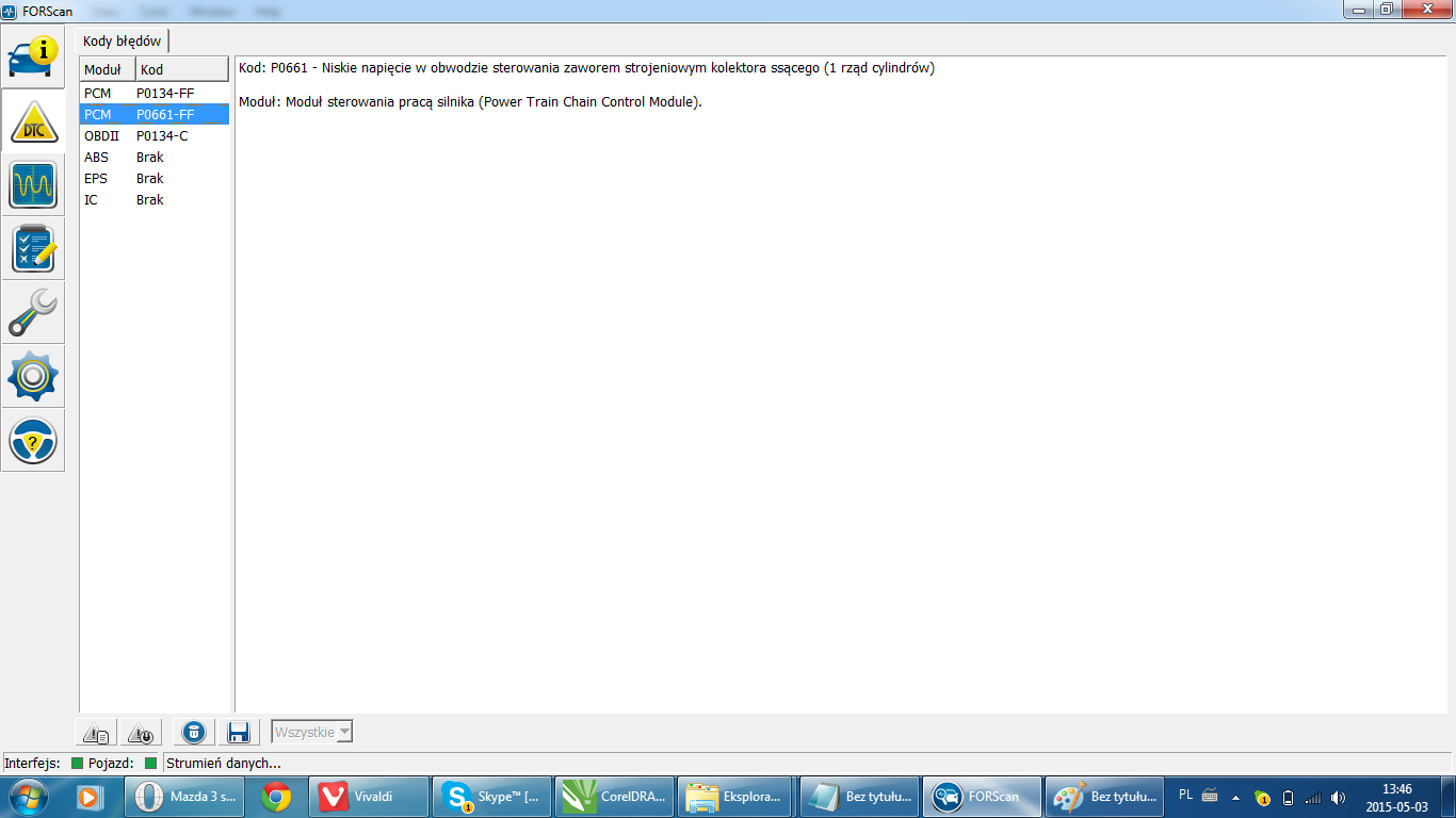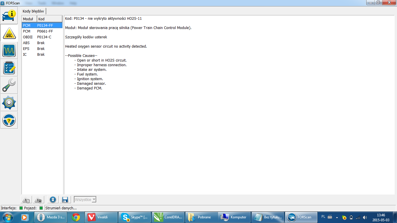 Mam mazdę 3 2005 2.0 benzyna-gaz, jakiś czas temu zapalił mi się check engine. Po podpięciu do komputera wyświetlił się błąd p0134 – nie wykryto aktywności HO2S-11 (w xcan xl p0134 obwód sondy lambda blok cyl.1 czujnik1) oraz błąd p0661 – Niskie napięcie w obwodzie sterowania zaworem strojeniowym kolektora ssącego (scan xl nie widzi tego błędu). Początkowo podejrzewałem sonde lambda i zdecydowałem się ją wymienić na jakąś używkę z allegro, po przelutowaniu wtyczki i podłączeniu, zmierzyłem napięcie sondy miernikiem na rozgrzanym silniku i wynosiło ono ok. 0,9 v – napięcie było właściwie cały czas stałe, spadało tylko po dodaniu gazu. Oczywiście po przejechaniu kilkunastu kilometrów znów zaświecił się check. Najdziwniejsze w tym wszystkim jest to, że ForScan pokazuje napięcie sondy w przedziale 0.06V do 0.09 V, zaś na mierniku mam napięcie ok. 0.9V. (Napięcie jest właściwie identyczne na starej i nowej sondzie). Bardzo proszę o pomoc, przeczytałem już mnóstwo tematów i naprawdę zaczyna brakować mi już pomysłów. Pragnę też zaznaczyć, że wydaje mi się, że wzrosło także spalanie. Pod spodem zamieszcza screeny z programu.