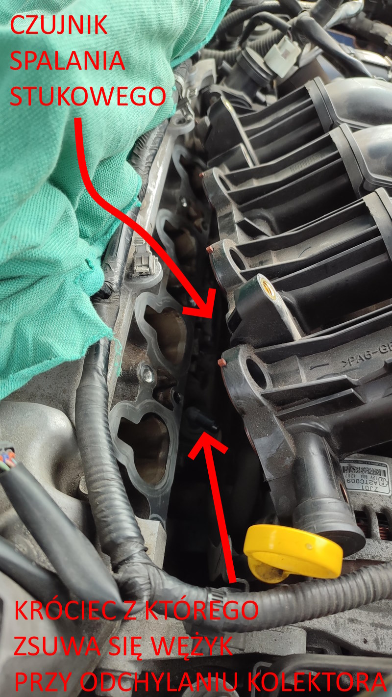 14. Cały kolektor delikatnie ciągniemy od lewej strony (od bagnetu oleju) odchylając na tyle na ile się da i ukaże się nam czujnik spalania stukowego pod kolektorem. Dużo elementów blokuje odchylanie kolektora więc warto zapewnić sobie druga osobę do odchylania lub jakoś zblokować pozycję odchyloną.