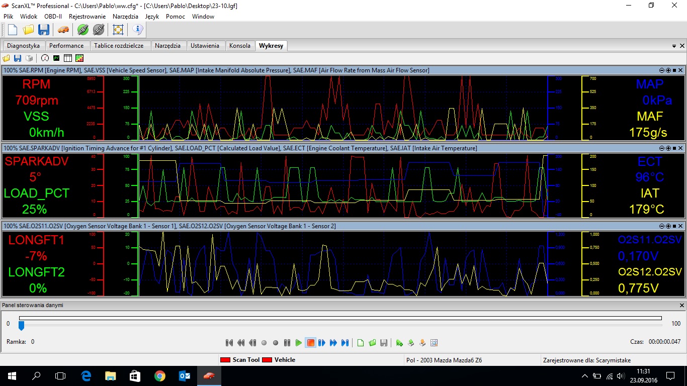 Podłączę się do tematu. Sprawdziłem dzisiaj stan swojej sondy i niestety nie wygląda to zbyt dobrze. Wydaje mi się że nie tak powinien wyglądać wykres z pracy sądy. Mowa oczywiście o sondzie przed katalizatorem. Na wykresie oznaczona kolorem niebieskim na samym dole. Prośba do kolegów o opinię na ten temat. Pozdrawiam