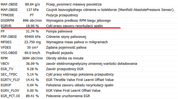 Co ciekawe… po przekroczeniu 3000rpm, parametr ERGVR (Cykl pracy zaworu recyrkulacji spalin) ma niemalże stałą wartość ~18.90% (na wykresie czerwona strzałka).