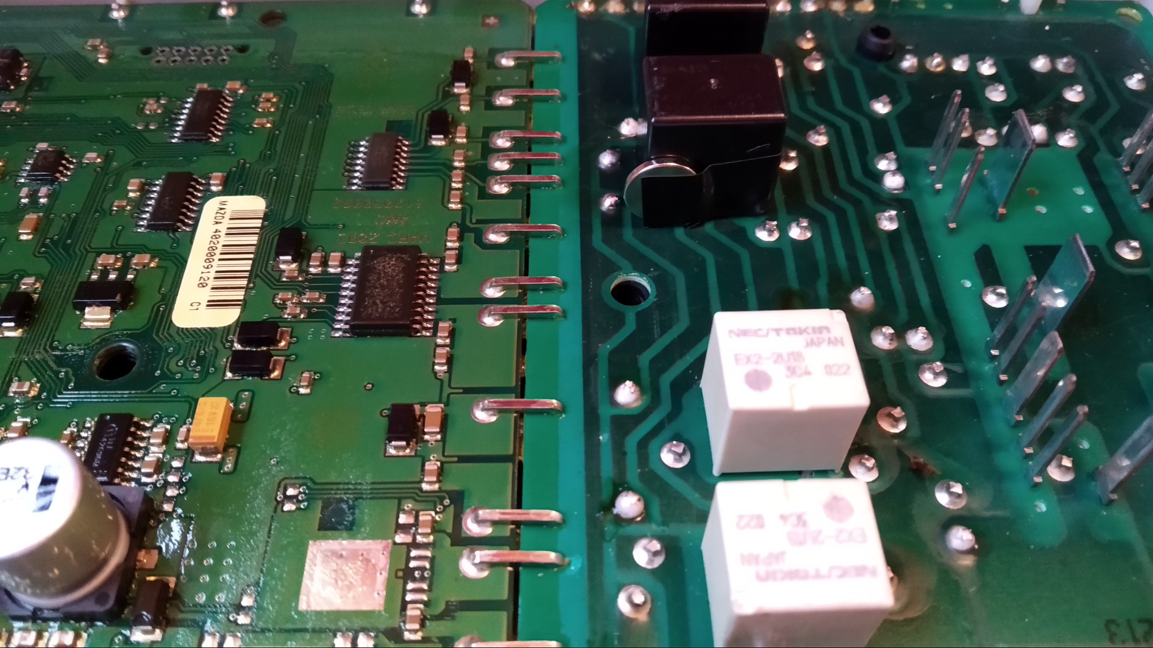 Przypadek jak u wszystkich – brak postojówek, oświetlenia tablicy wskaźników i przeciwmgielnych. Lekkie stuknięcie w skrzynkę bezpieczników – działają, kolejnie stuknięcia – nie wyłączają rzeczonych świateł – znaczy winny przekaźnik, a nie zimny lut. Rozebrałem, przekaźnik wlutowany tak jak opisane we wcześniejszych postach – wymiana bardzo trudna. Postanowiłem zgodnie z powiedzeniem "pokaż kotku co masz w środku" zajrzeć do jego wnętrza. Rogi obudowy przekaźnika trzeba ściąć ostrym nożem, schodzi cała bardzo ładnie, pod spodem jest cieniutka gąbka.Obudowa kryje jeszcze jedną, podobną obudowę plastikową owiniętą drukiem wykonanym z blachy miedzianej – dolutowanie nowego przekaźnika do tego układu nie powinno być problemem, wszystko ładnie widać. Podążając dalej naciąłem tę wewnętrzną obudowę by obejrzeć styki przekaźnika. Okazuje się, że do magnetycznej blaszki przyciąganej cewką jest dogrzany lub doklejony pasek blachy miedzianej z właściwym punktem styku. Powodem braku kontaktu między stykami jest przerwa jaka się pojawia pomiędzy blaszka magnetyczną, a tym paskiem miedzi (lub blachy sprężynowej) – w związku z tym, że jest dość oporna na odkształcenie, zakrzywiłem lekko styk stały (ten nad cewką) w kierunku styku ruchomego.