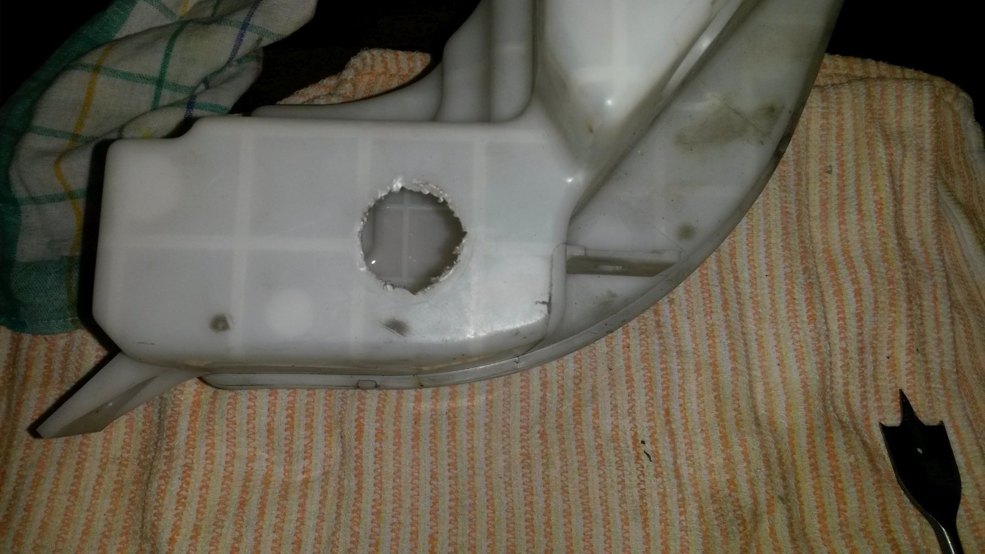 Po zdjęciu zderzaka i demontażu zbiorniczka płynu spryskiwaczy (trzymają go 2 śruby i jedna nakrętka) możemy zabrać się do wiercenia otworu w zbiorniku. Potrzebne nam będzie takie o to dziwne narzędzie: