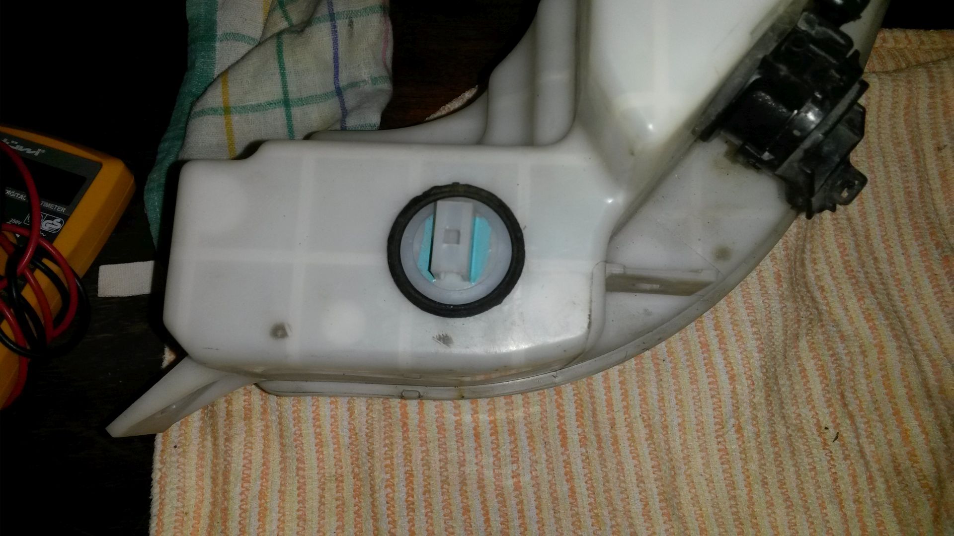 UWAGA!! Miejsce montażu pływaka jest odsunięte od fabrycznego punktu montowania w dużym zbiorniku. Przewody kontaktronu są krótkie. To miejsce dało mi na styk możliwość ;) warto zastanowić się nad przedłużeniem kabli lub zlokalizowaniu pływaka w innym miejscu.