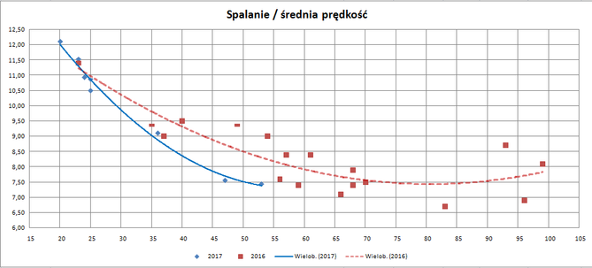 Poniżej przedstawiam moje wykresy spalania w zależności od średniej prędkości. Dane z dystrybutora. Dwa wykresy, bo jeden 2016 rok a drugi 2017.