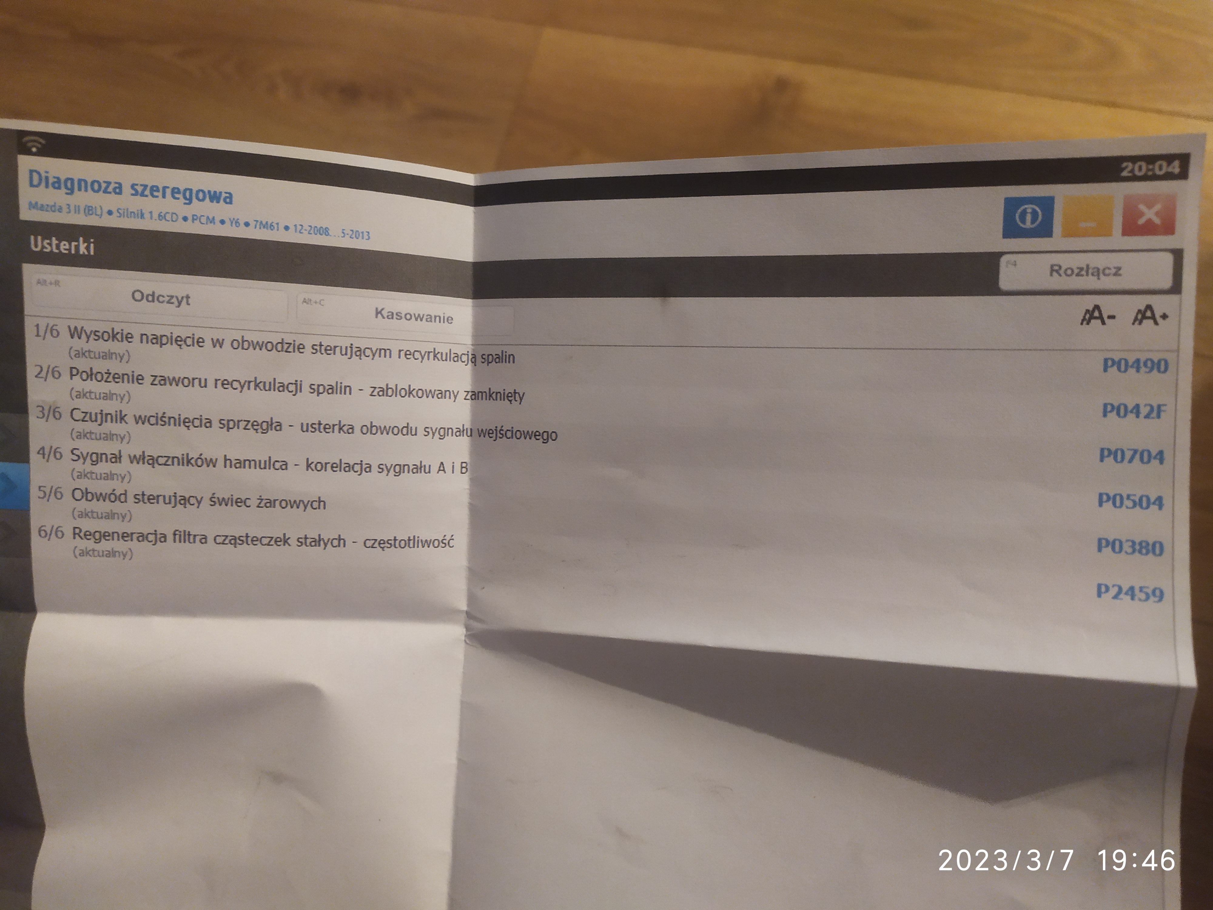 Cześć, mam problem z moją mazda 3, 1,6 diesel. Od wczoraj weszła w tryba awaryjny auto po prostu nie ma mocy. Nadmiernie że na jesieni auto było u mechanika gdzie był sprawdzany osprzęt czy nie ma wycieków i wymieniany był również zawór EGR na nowy. Po wymianie zawory zauważalne były spadki mocy – tak jakby turbina się nie załączała. Co pojawiałem się na reklamacje do mechanika to jak na złość auto pracowało jak należy i nie wywalało żadnych błędów na kompie więc nie było się do czego przyczepić. Niestety problem był nadal a ja dalej auto użytkowałem aż do wczoraj...Po sprawdzeniu na kompie cała litania błędów. Silnik zarzygany olejem. Podejrzenie mechanika że to wina zapchanego DPF ( nadmiernie że filtr już czyscilem ok 50 tys km wcześniej ). Aktualny przebieg auta ok 320 tys.w załączniku błędy które się pojawiły.