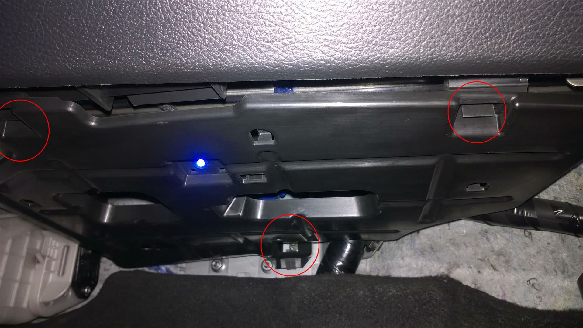 Następnie demontujemy osłonę pod schowkiem pasażera, wystarczy nacisnąć na 2 zatrzaski z przodu osłony. Przy montażu należy zwrócić uwagę aby osłona weszła na śrubę z tyłu (na grodzi):