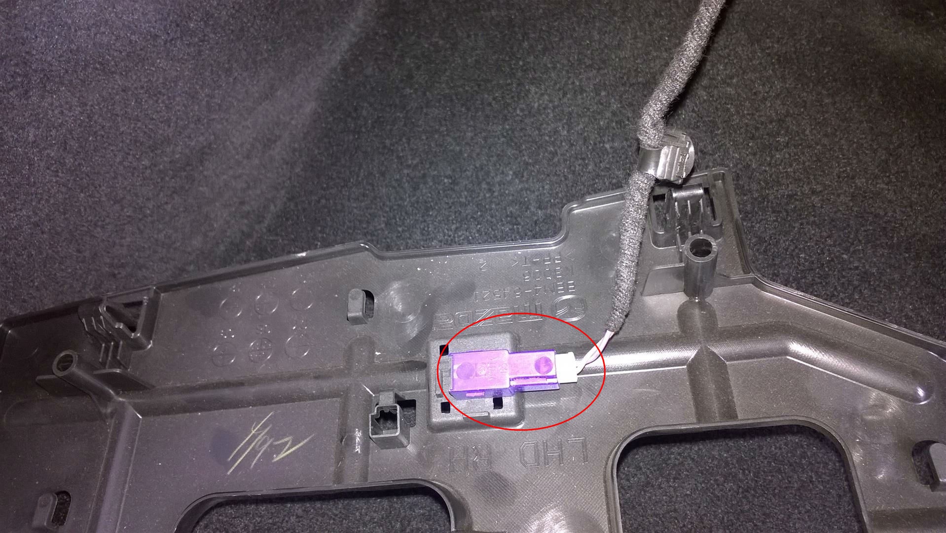 Następnie za pomocą małego śrubokręta płaskiego odpinamy wtyczkę od lampki podświetlenia nóg pasażera. Można też od razu wypiąć spinkę przewodu: