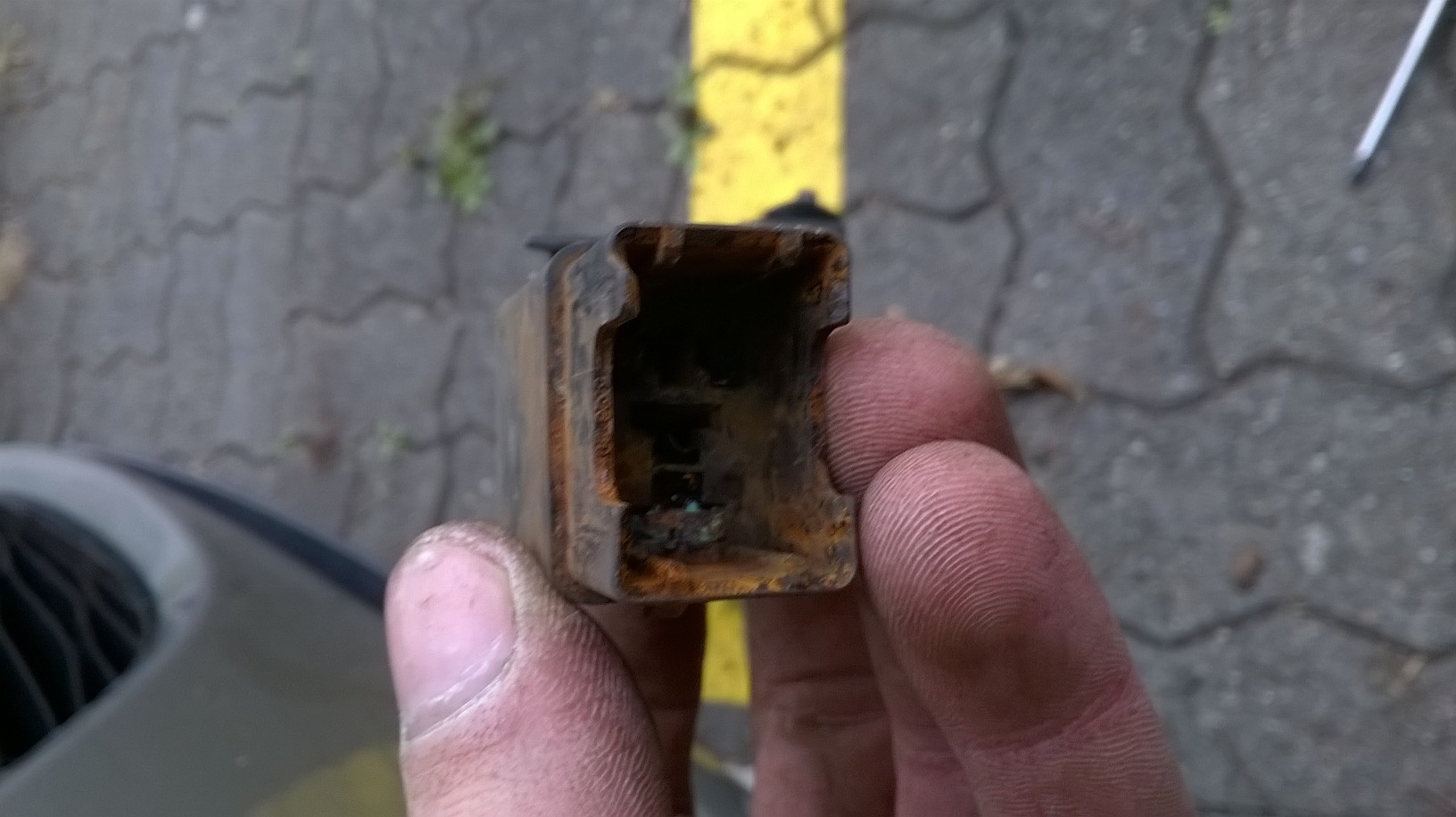 Dzieki serdeczne za celna wskazowke! :–) . Oczywiscie byl to przekaznik. Z tym, ze w moim przypadku nie znajdowal sie na nadkolem tylko wisial przed chlodnica. Zajelo mi to troche czasu bo nie za bardzo wiedzialem czego szukam ale przez przypadek zobaczylem wiszaca koste przy chlodnicy. Wyglada na to, ze ktos juz przy tym grzebal bo na kostce byly pozostalosci starej tasmy izolacyjnej, wystarczylo zalozyc opaske zaciskowa, schowac w dobrym miejscu bo dlugosc kabla na to pozwalala i kostka nie byla by nastawiona na wode. Ale trudno, kostka byla cala ruda od rdzy. Probujac wyjac kombinerkami przekaznik, skruszyl sie w drobny mak razem ze stykami (zalaczone zdjecia). Cala kostka wraz ze stykami + przekaznik jest do wymiany. 4 kable, latwy dostep wiec latwo to bedzie polutowac/zamontowac. Czy ktos z Was zna profesjonalna nazwe tej kostki wraz z przekaznikiem? Chcialbym sobie zamowic przez internet ale nie wiem jak to znalezc/nazwac. Bardzo prosze o pomoc i dziekuje za pomoc w znalezieniu problemu. Pozdrawiam