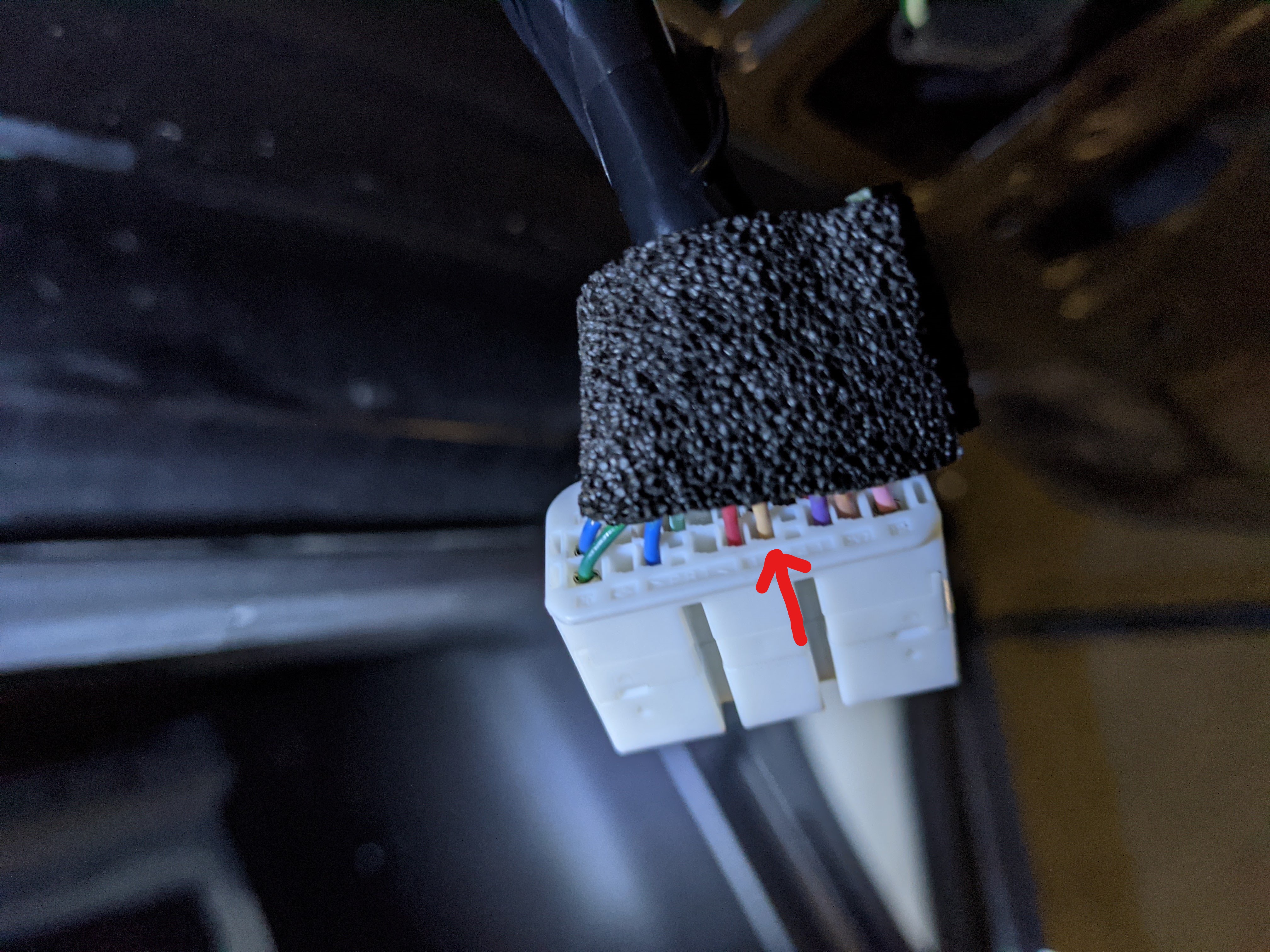 Podpiąłem się prowizorycznie z żarówką do kostki w klapie (tej wychodzącej z uszczelki – latwiej tam zapewnić połączenie z konektorem, którym zarobiony jest przewód) i zadziałało. Włączyłem Ignition na ON, światła ustawiłem na mijania i po prostu włączyłem przeciwmgielne tylne.