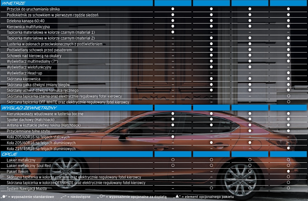 Stworzona zgodnie z naszą przyciągającą uwagę filozofią „KODO – Dusza ruchu” nowa Mazda3 Sedan rozbudza nasze oczekiwania od pierwszego wejrzenia. Całkowicie zmieniona konstrukcja, ulepszona pod każdym względem, stanowi olbrzymi krok naprzód w klasie samochodów z nadwoziem sedan. Teraz oferujemy pełen wachlarz zaawansowanych funkcji technologii SKYACTIV, dostarczając bezkompromisowe połączenie ekscytujących doznań i prowadzenia przy zachowaniu wyjątkowo niskiego zużycia paliwa i emisji CO2 .