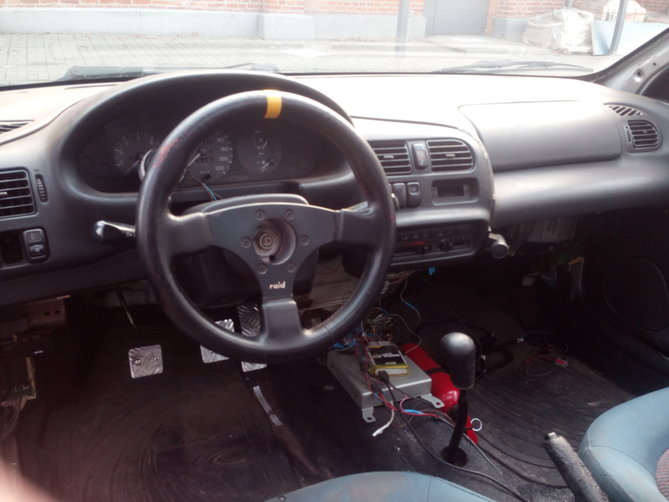 W kabinie, nareszcie postanowiłem usunąć koło od AutoSana i wrzucić jakąś fajerę. Nie obyło się bez zgrzytów, aukcja była opisana jako "około 33cm", kierownica przyszła ... 28cm. Nie dość że "nielegalna" to jeszcze malutka. Zanim jednak nastąpi zwrot do nadawcy postanowiłem założyć i przetestować.