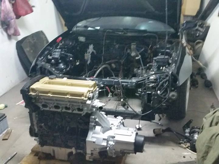 Silnik w budzie, półoskie siedzą, poduszka tylna też, ogólnie została kabelkologia, auto musi choć do zimy odpalić, porywa zmieniona do wkładania silnika