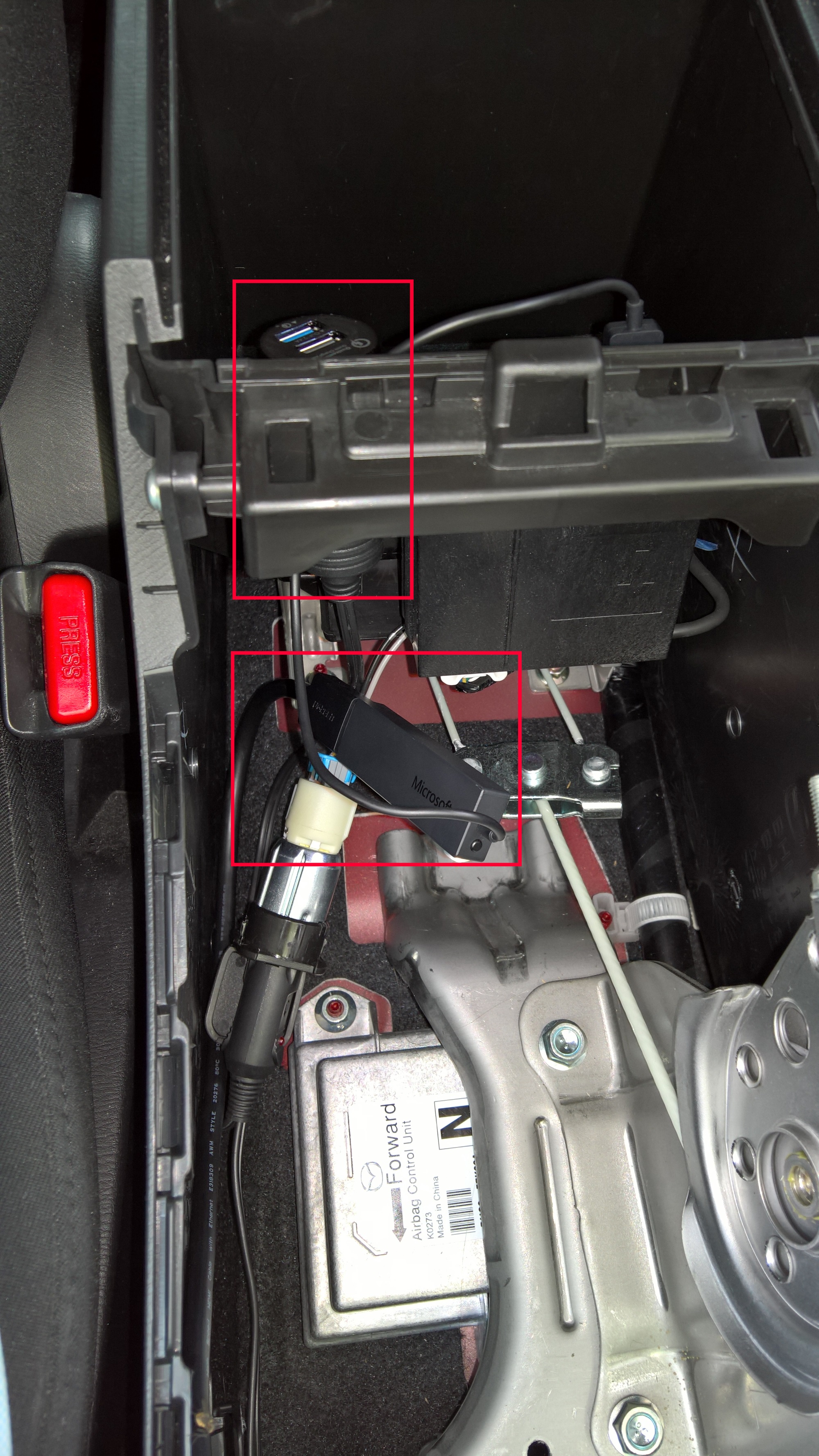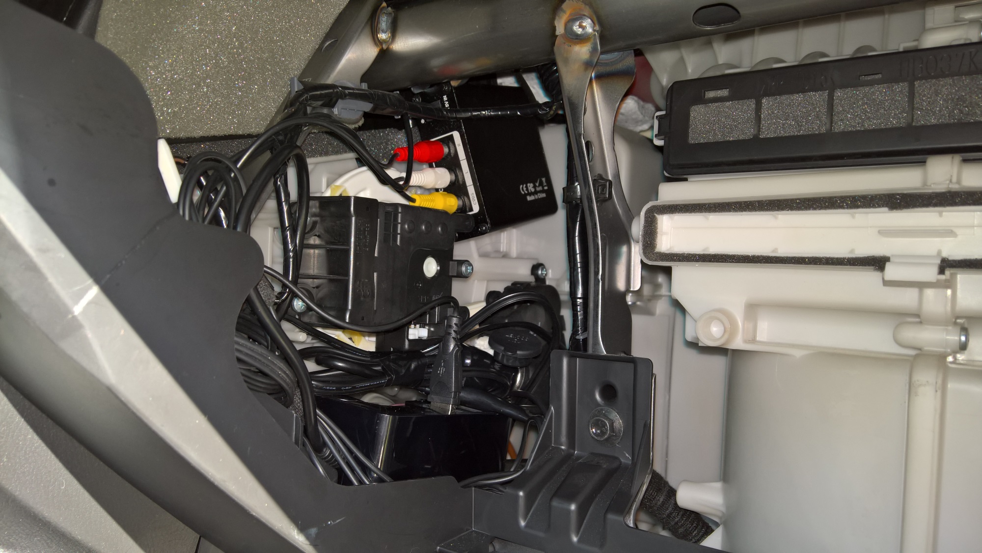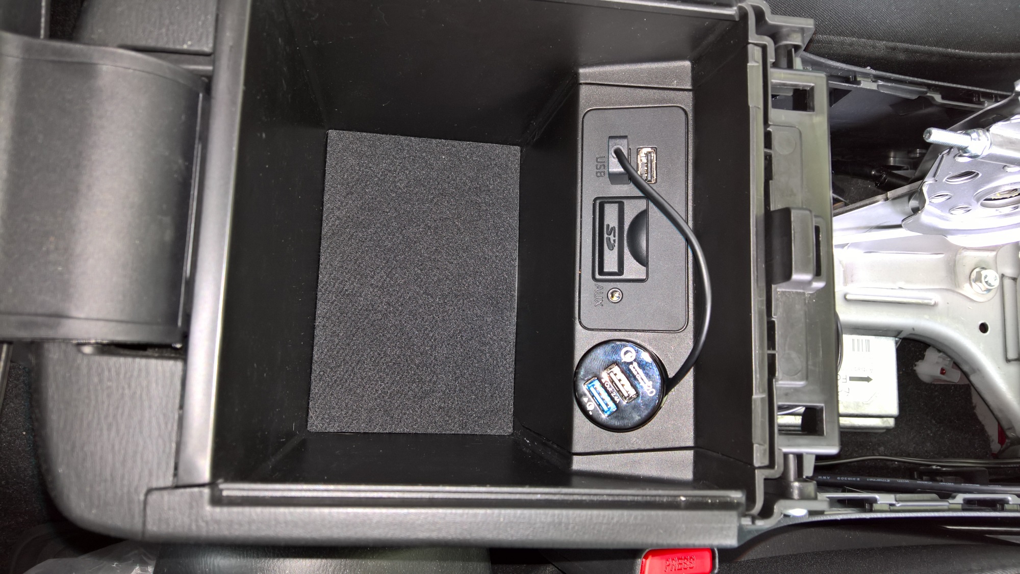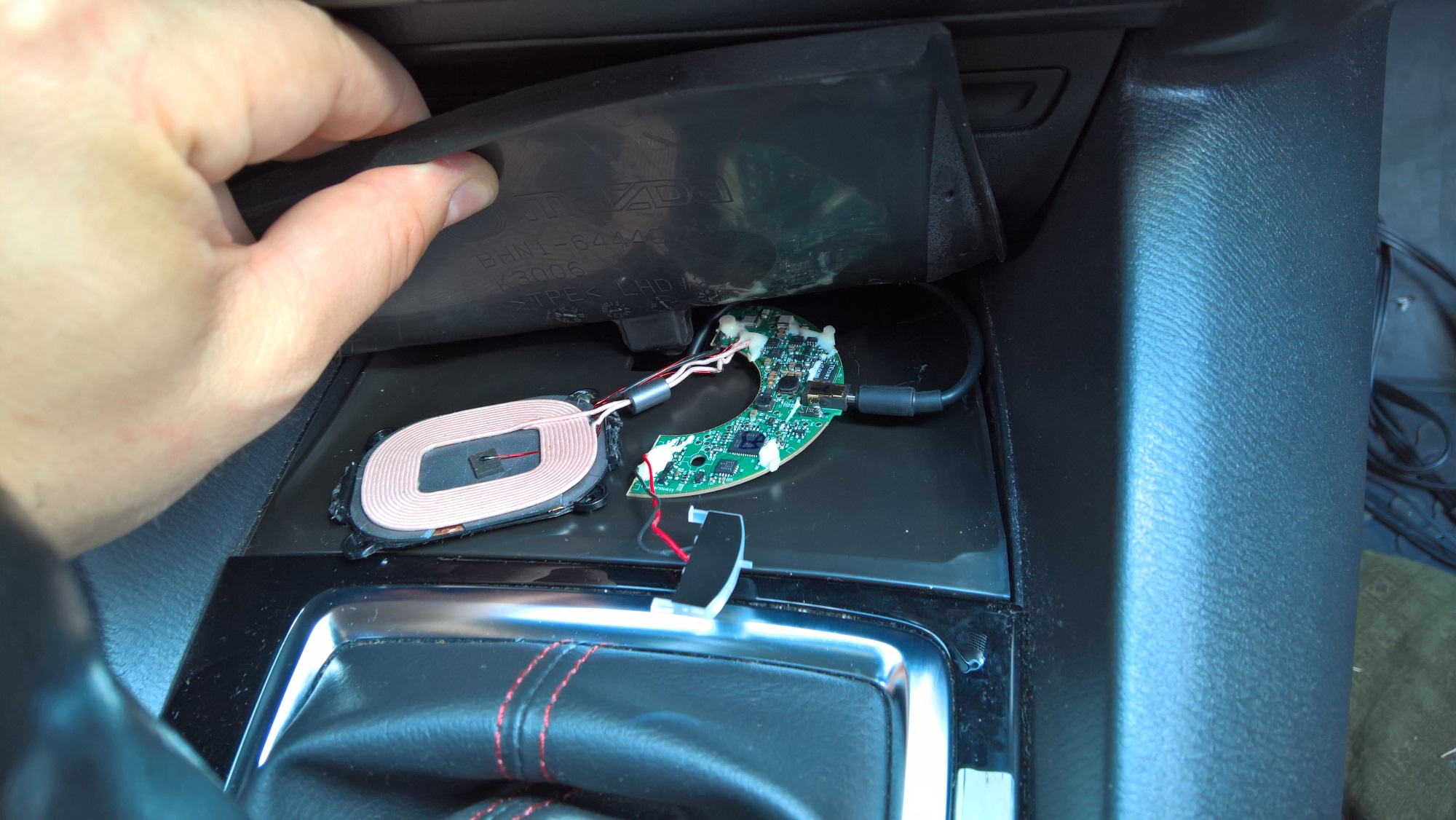 4.Dowolną ładowarkę bezprzewodową możemy zdemontować w celu wyjęcia samej elektroniki (polecam, więc coś taniego żeby nie było szkoda). Możemy uzwojenie umieścić pod gumą, która znajduje się przed skrzynią biegów a przewód możemy poprowadzić poprzez dziurę pod gumą. Jak dobrze się pokombinuje to po instalacji nie ma śladu