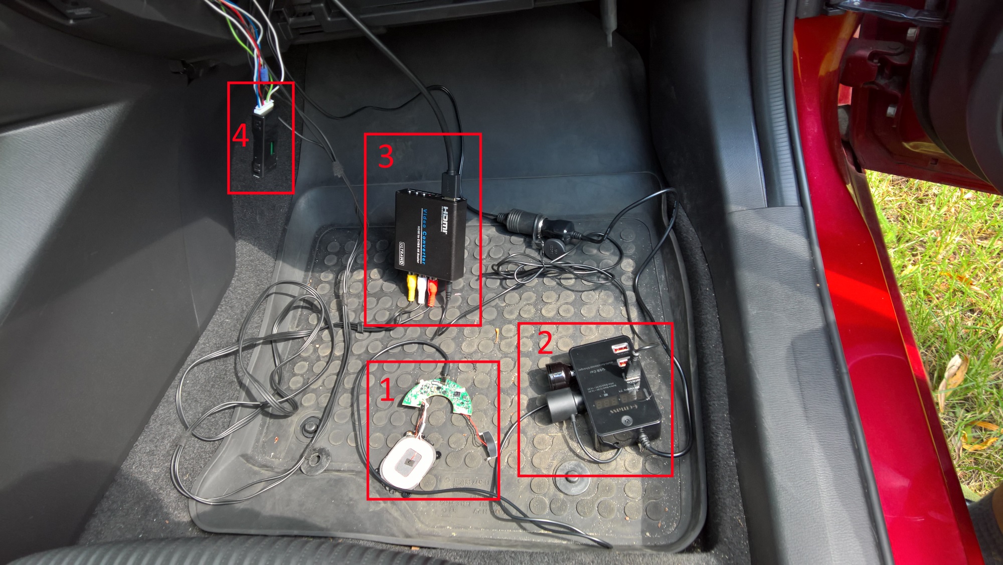5. Do schowka prowadzimy wszystkie przewody i niezbędne urządzenia. Na zdjęciu poniżej widać Ładowarkę [1], którą zamontowaliśmy w poprzednim punkcie podłączoną do przetwornicy [2], która jest zasilana z gniazda zapalniczki i zasila dodatkowo konwerter HDMI –> A/V [3], który opisany jest w wątku „Mobile Mazda! Jak dołożyć opcje AV in. (How to add AV in)” wraz ze sterownikem [4]. Przetwornica dodatkowo zapewnia nam opóźnienie włączenia w celu zmniejszenia obciążenia w trakcie rozruchu oraz monitoring poboru prądu, jeśli w przyszłości będzie podłączanych więcej urządzeń to warto wiedzieć jak obciążamy akumulator.