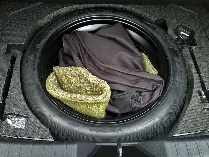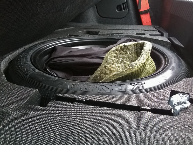 Ja również stałem się szczęśliwym posiadaczem koła dojazdowego. Koło kupione na jednej z bardziej popularnych stron zajmujących się sprzedażą "dojazdówek". Rozmiary typowe T125/70D16 96M, rok produkcji 2016, Kenda. Do tego dokupiłem lewarek, klucz teleskopowy i pokrowiec na przebite koło (w miejsce "dojazdówki" nie wejdzie, a czyste z pewnością też nie będzie). Koszt razem z przesyłką 577,99 zł. Styropian przycięty we własnym zakresie. Jak widać na zdjęciach (sorry za jakość pierwszego) koło w sedanie nie wystaje z żadnej strony. Klucz wylądował w kole zawinięty w pokrowiec. Śrubę mocującą koło sobie darowałem – koło przykryte od góry podłogą bagażnika, wzmocnioną gumową matą ochronną – nie hałasuje. Też zastanawiam się gdzie tu upchnąć lewarek...