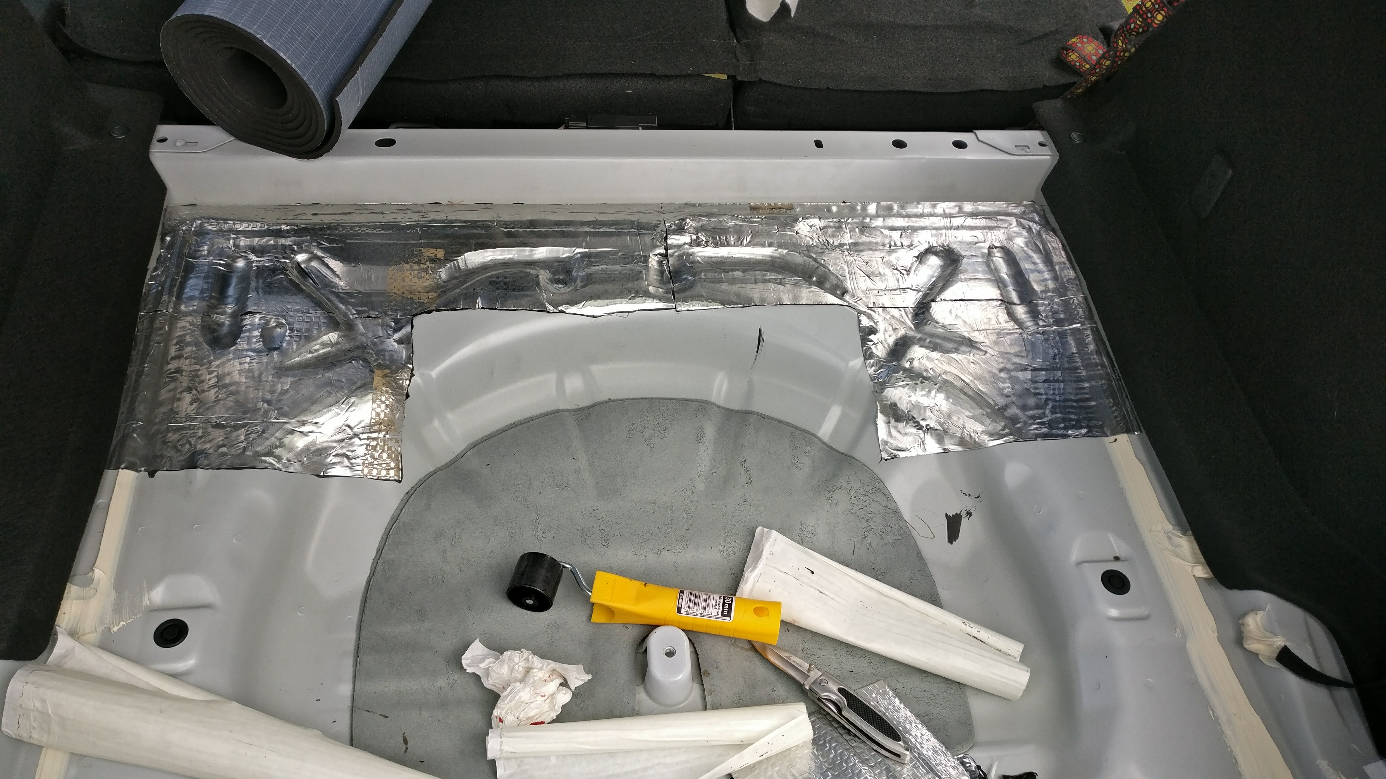 Ogólnie na razie zrobiłem tył ( bagażnik, nadkola ). To co zostało to podłogo, nadkola przednie i drzwi ( nie wiem czy w dach będę miał czas się bawić ). Ogolnie wyszedłem z założenia że nie ma co przesadzać, to znaczy wiadomo że najwięcej hałasu robią elementy o małej sztywności i dużej powierzchni. Dlatego jeżeli chodzi o maty butylowe nie obklejałem wszystkiego dokładnie, bo imo oklejanie np. szkieletu nadkola tylnego ( tego które idzie od podłużnicy a na górze jest mocowanie amorka ) troche mija sie z celem, ale to tylko moja opinia. Do wygłuszenia tej części użyłem maty butylowej 2 mm oraz pianki 6 mm ( zgodnie z zaleceniem bitmat.pl ) .