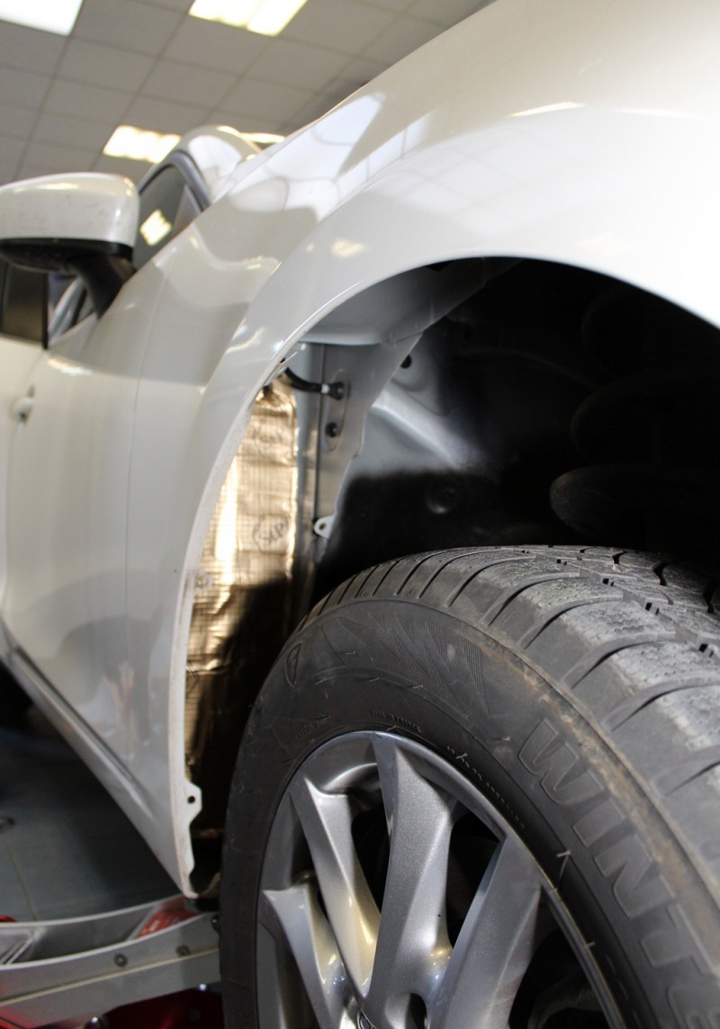 Wyklejenie za kołem niewiele daje, tam jest w miarę gruba blacha więc drgań tak bardzo nie przenosi. Za to obklejenie samego plastikowego nadkola daje spore korzyści.
