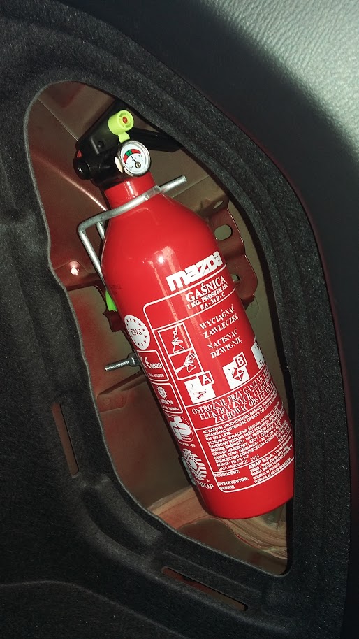 Ja również dziękuje – gaśnica zamontowana. Creet, patent z dodatkową wkładką gumową jak u Kolegi załatwia temat stukania (ja uciąłem kawałek gumy na wymiar). Aby było ciekawiej dodam, że w środku mam również szary / beżowy podkład. Mazda odebrana tydzień temu, rocznik 2016.