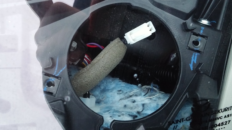Montaż jest stosunkowo prosty. Odczepiamy maskownicę byle czym i widzimy nasze cudo, które trzymają 2 śrubeczki.