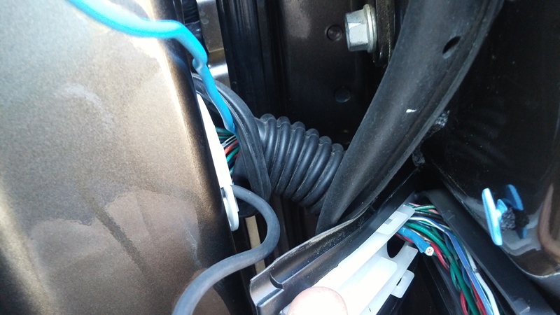 Teraz czeka nas trochę zabawy z przepuszczeniem kabla do drzwi. Łączenie jest na kostce, ale na szczęście w tym białym kołnierzu są otwory, którymi możemy puścić kabel i schować to z powrotem pod uszczelkę. Najlepiej posłużyć się jakimś pilotem – ja wziąłem kawałek druta. Niebieski to pilot a czarny to przewód ze zwrotnicy (w środku są 2 żyły)