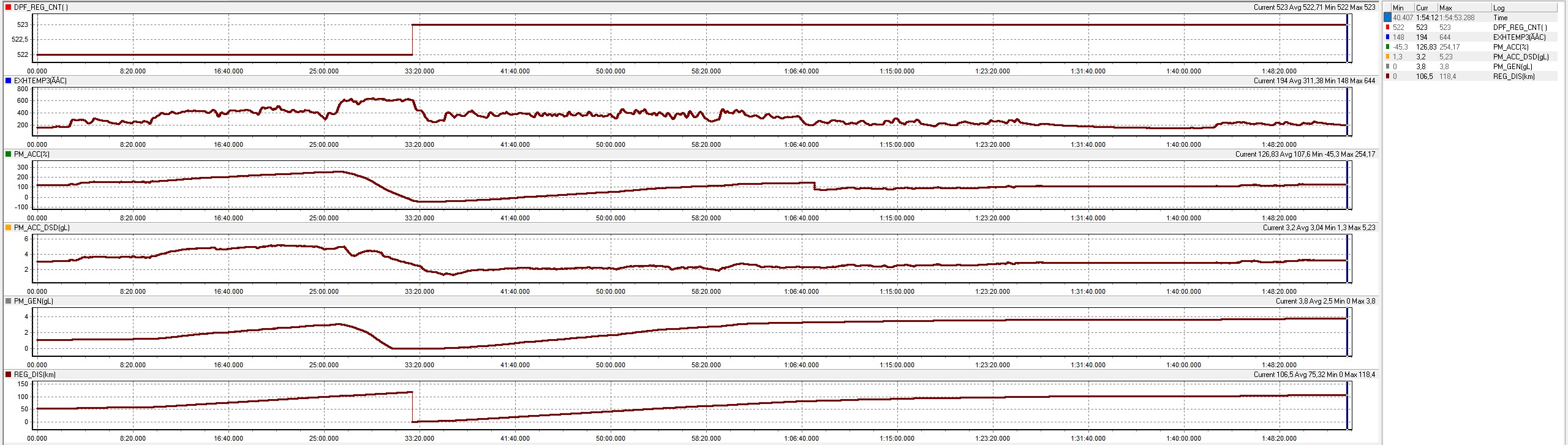 PM_ACC, PM_ACC_DSD – ilość sadzy w filtrze, jedna wartość aktualna, druga "desired" czyli rządana. Obie wartości powinny rosnąć pomału i liniowo, szybciej w mieście, wolniej na trasie. Mogą też przy sprzyjających warunkach lekko maleć. Jakiekolwiek gwałtowne skoki najpierw jednej wartości, później drugiej świadczą o zapchanym filtrze. Wypalanie jest aktywowane po osiągnięciu wartości ok 6 g/L.