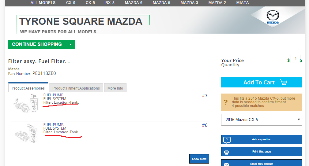 Dwa ostatnie zdjęcia są ofertą sklepową z częściami do Mazdy cx5 z 2015 roku. Sprzedają filtr paliwa i informują że mieści się on w baku