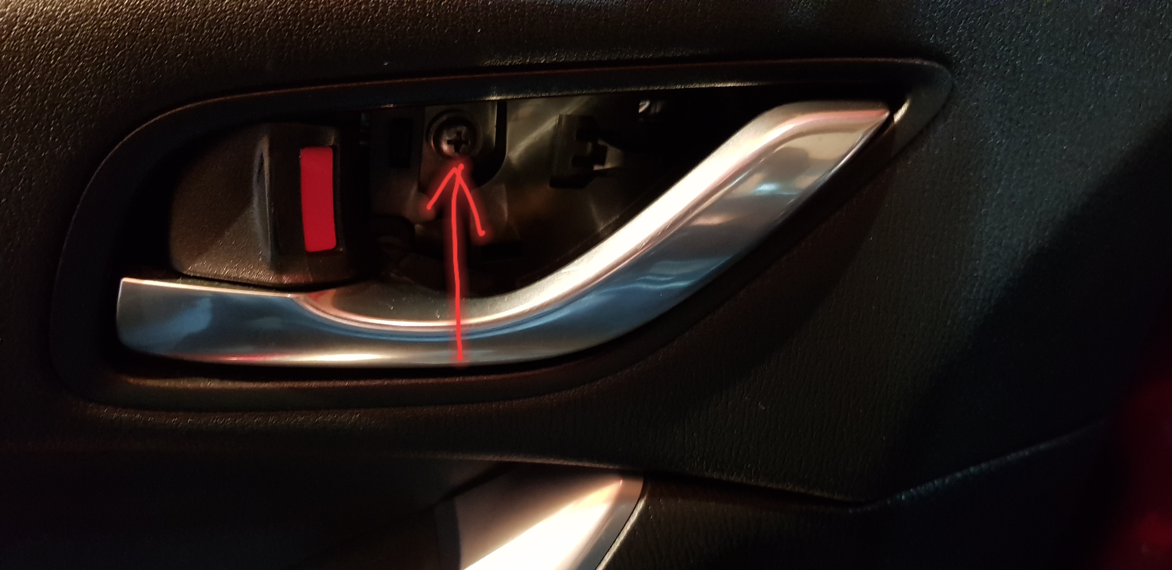 - Następnie od dołu podwaźajac łyżką do plastików lub palcami ciągnąć do siebie dość energicznie wyzwolić z spinek. Odpiąć kostki panelu sterowania szyb. W górnym lewym rogu drzwi zobaczymy dość sporą biała zaślepke, należy ją zdjąć podwaźając a pod nią ujrzymy widok jak na foto tj. Trzy śruby 10. Przed odkrecceniem odpiąć dwie kostki elektryczne poniżej zaślepki.