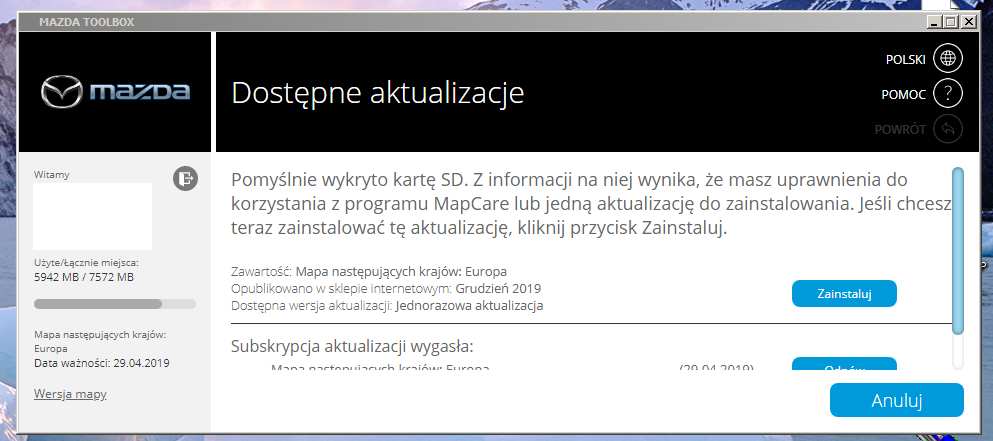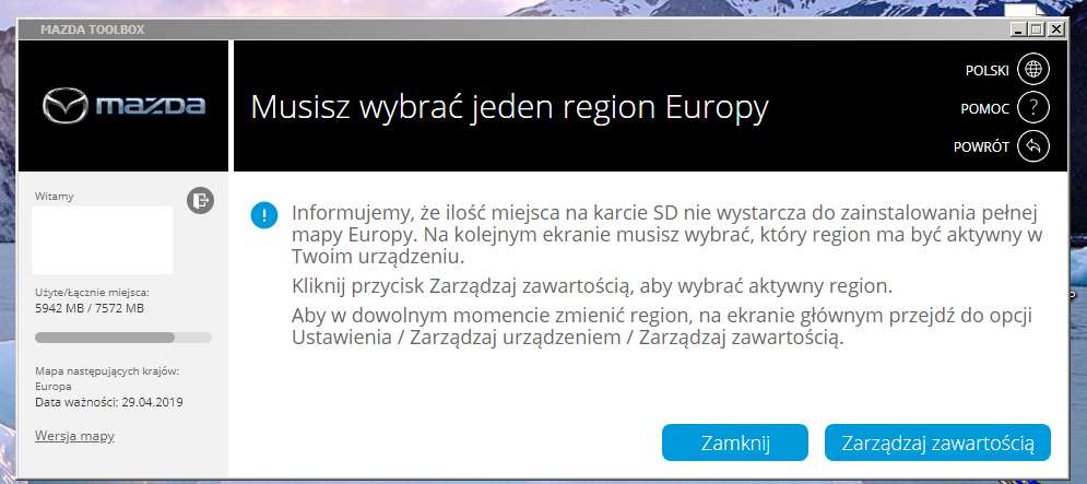Na samym początku zgłasza komunikat, że brak wystarczająco miejsca na karcie SC i należy wybrać region. Dokonuje wyboru na Europę (ale dotyczy to cały czas 2018 r!). Następnie wszystko ok, ale wcale nie zostały mapy zaktualizowane do grudnia 2019 r. I tak w pętli. Załączam zrzuty ekranu.