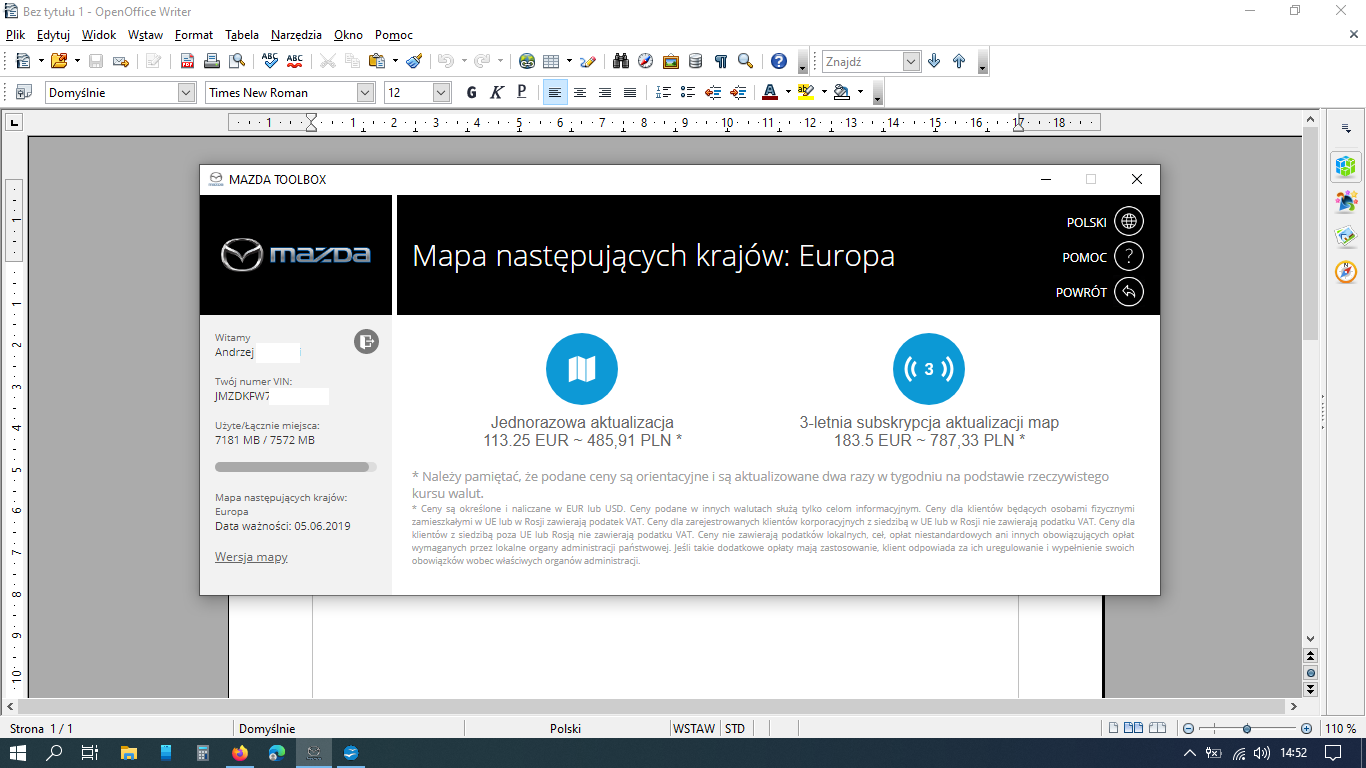 U mnie wszystko poszło bez problemu. Aktualizowałem kartę z CX-5 z 2017r. Wszystko poszło bezproblemowo – tzn. darmowa aktualizacja wygasła i zakupiłem trzyletnią usługę łączoną dla Europy za niecałe 93 Euro.