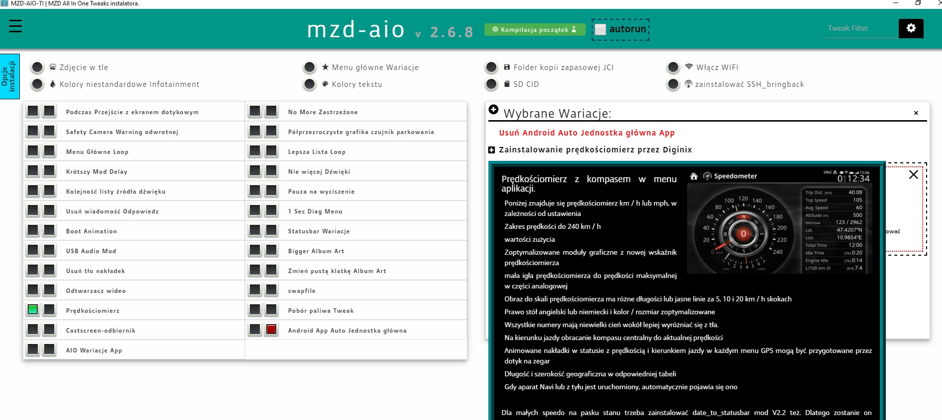 Kolega lupi2505 napisał ,że stał się posiadaczem CX5 z USA , a ja zasugerowałem ,że USA popularny jest program MZD-AIO-TI , który służy do instalacji dodatkowych aplikacji i konfiguracji w MZD connect . Prawdopodobnie mógł być w tym aucie zainstalowany dodatek do softu "Android Auto Headunit App" ,który zakłóca komunikację z Iphone po BT .Aby to naprawić można za pomocą MZD-AIO-TI wygenorować program do odinstalowania tej aplikacji z MZD w CX5 .Jest to bardzo proste , po zainstalowaniu aplikacji na kompie wyświetla się tabela ze zbiorem różnych dodatków do MZD z dwoma kwadracikami przy każdej nazwie .Po kliknięciu w kwadracik pojawia się odpowiednio :zielony kwadracik oznacza instalację , a czerwony deinstalację wybranego dodatku . Po wyborze odpowiednich działań naciskamy u góry w menu przycisk "start compliation " tworzy się wtedy odpowiedni program , który kopiujemy na pendrive USB i instalujemy go w gniezdzie USB w aucie .Na wyświetlaczu w aucie pojawiają się zapytania tekstem , które potwierdzamy dotykiem na wyświetlaczu tj. YES , OK , po wszystkim system się resetuje , wyjmujemy pendrive i cieszymy się zmianami na których nam zależało .