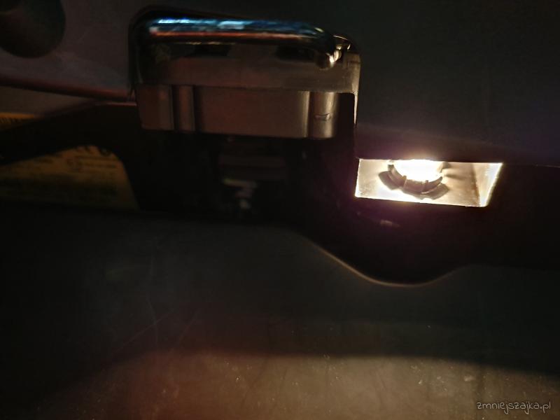 Wystarczy zdjąć schowek i masz elegancki dostęp do żarówki.Należy ścisnąć schowek po bokach i zdjąć zaczep po prawej stronie. :)