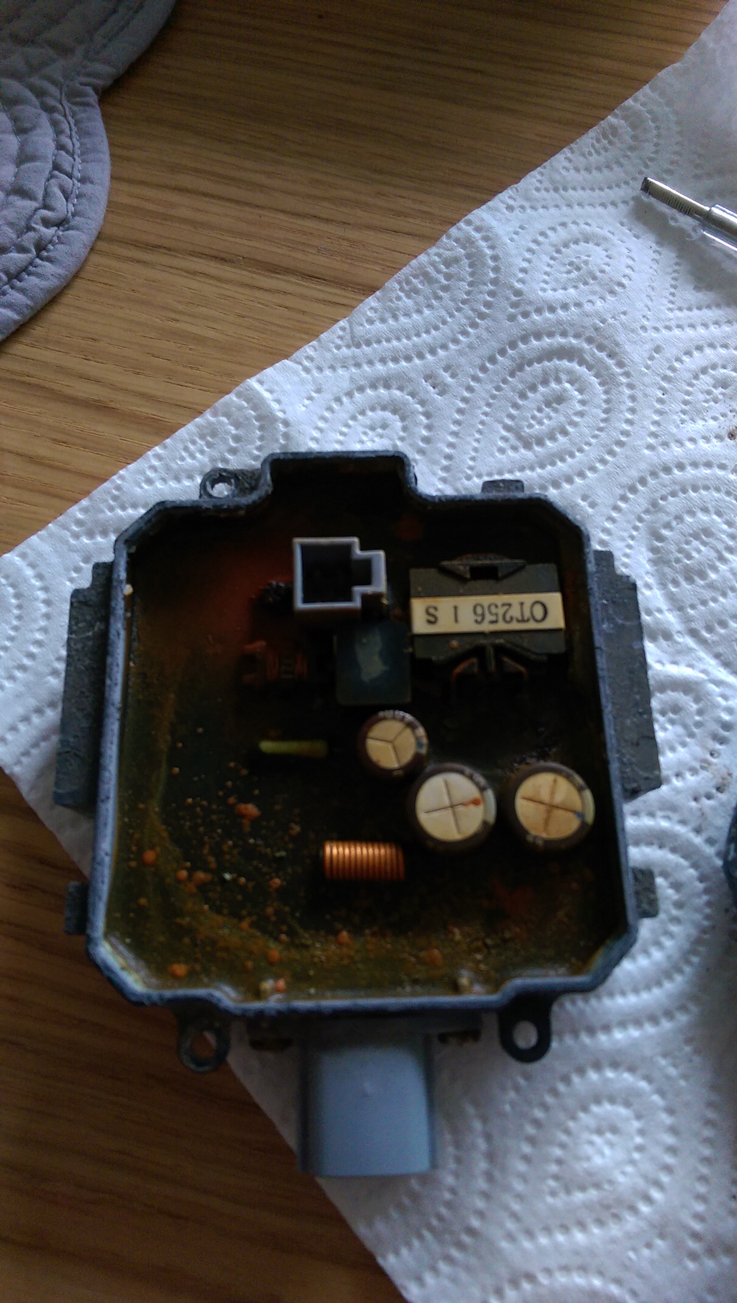 Zakończyłem naprawę swojej lampy i tak jak przypuszczałem miałem ten sam problem z przetwornicą jak kolega @Vito po zdemontowaniu przetwornicy znalazłem dużo wody a oprócz tego jeden przerwany przewód zaznaczony na zdjęciu nr.1 który wymagał zlutowania, po tej małej regeneracji żarówka świeci <jupi>