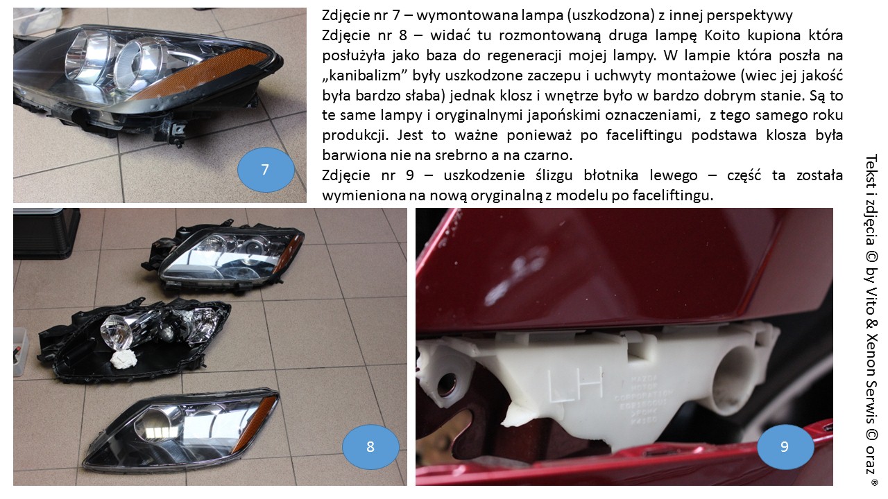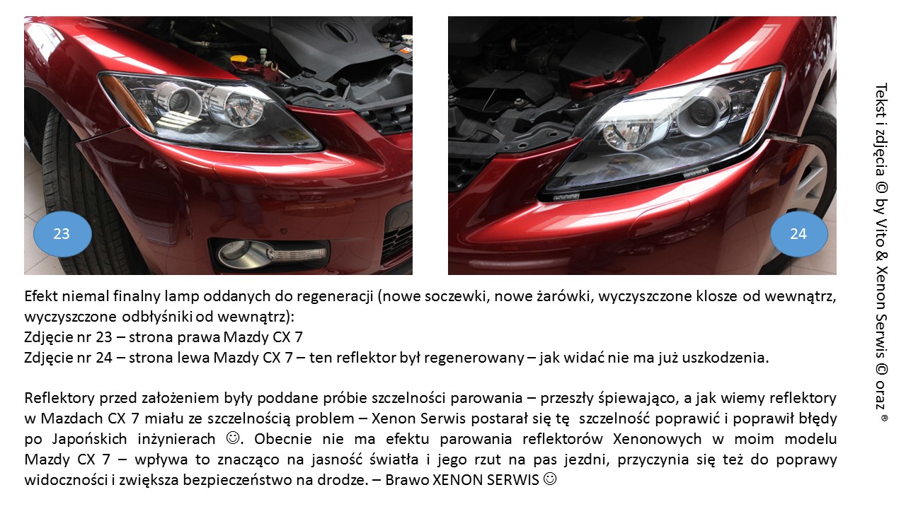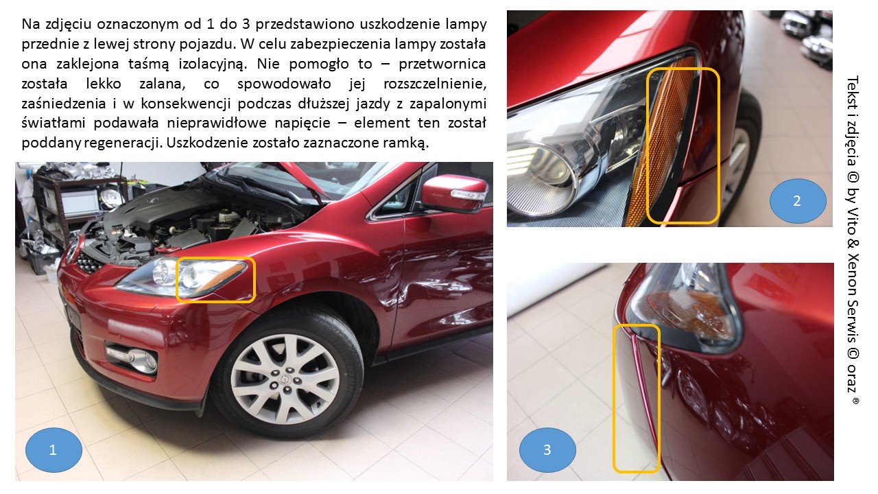 Wracając do regeneracji xenonów – ja jedną kompletną lampę kupiłem na aledrogo i jest super, nie paruje itd. Natomiast druga parowała to poprosiłem firmę, która regeneruje takie elementy o pomoc – zrobili i pomogło na tydzień. Później reklamacja i znowu pomogło, tym razem na 4 tygodnie. Dalej paruje, w dolnej części lampy. Podobno ten typ tak ma, ale jak to jest że ten lewy nie paruje a prawy tak? Przy okazji się okazało, że ta przetwornica co była zamontowana na jedną "śrubę" jest od Mazdy 6 i przez ponad 30kkm świeciła jak normalnie (gdyby nie samotna śrubka to pewnie by świeciła dalej...).